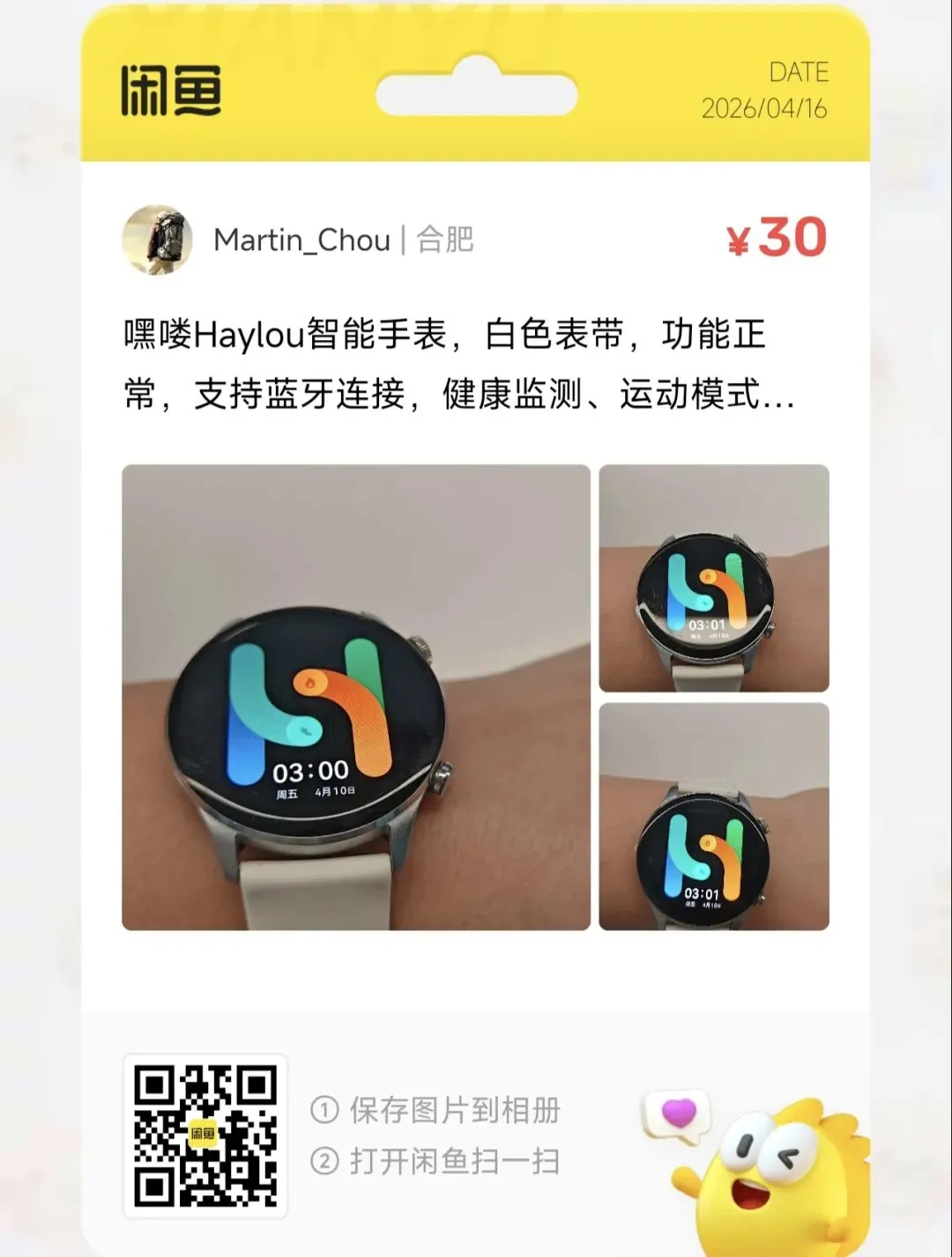 一台30元的嘿喽Haylou智能手表,白色表带,功能正常