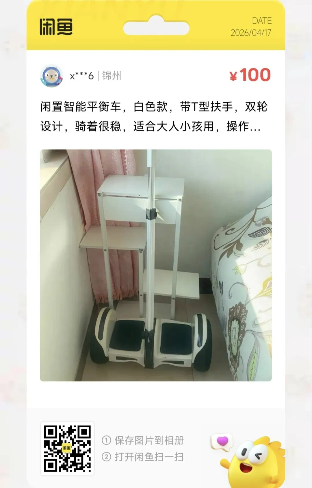 一台100元的智能平衡车,白色款,带T型扶手,双轮设计,骑着很稳,适合大人小孩用,操作简单,功能正常