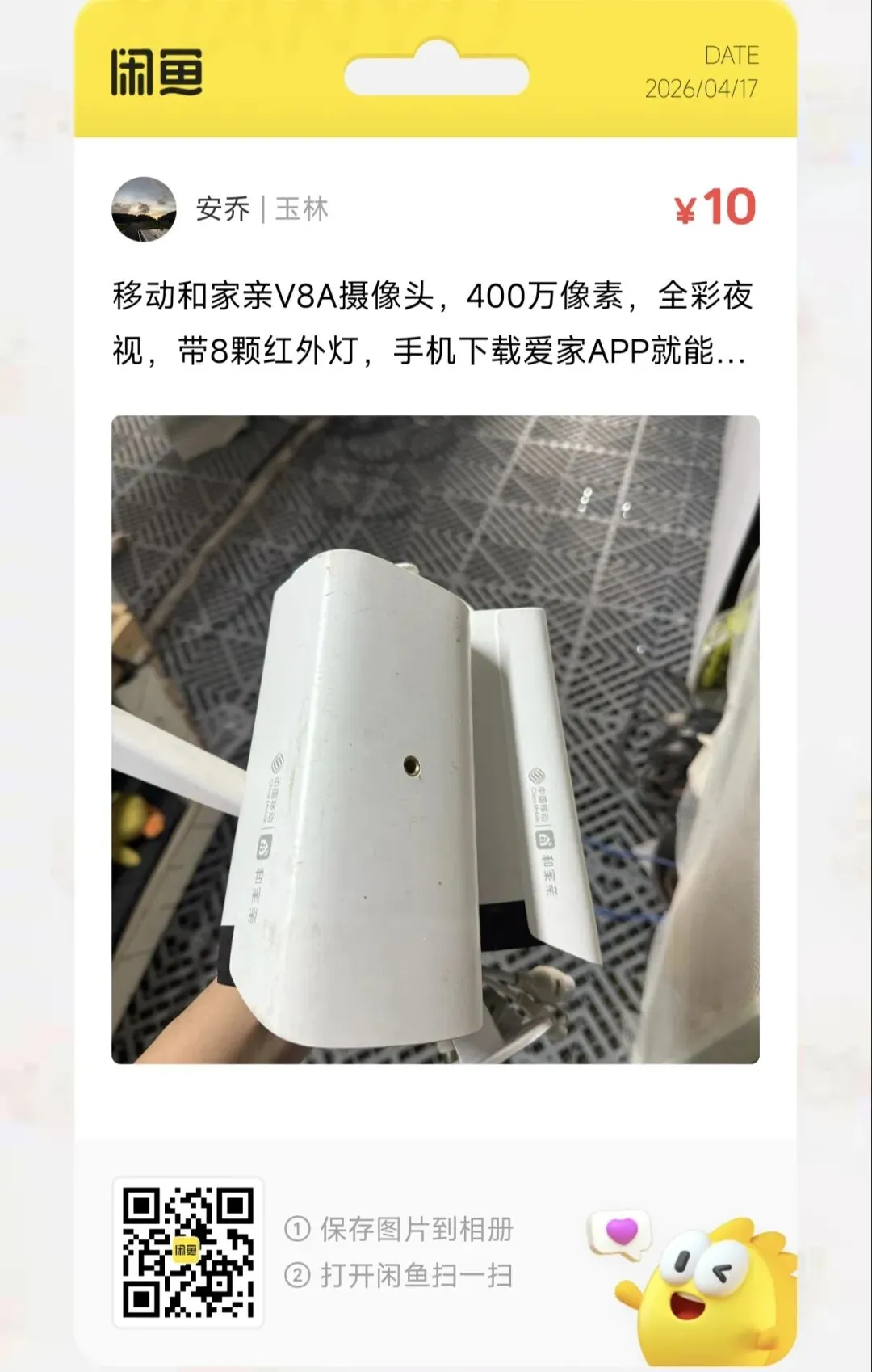一台10元的移动和家亲V8A摄像头,400万像素,全彩夜视,带8颗红外灯,手机下载爱家APP就能看,插网线用,带底座,配件都在。