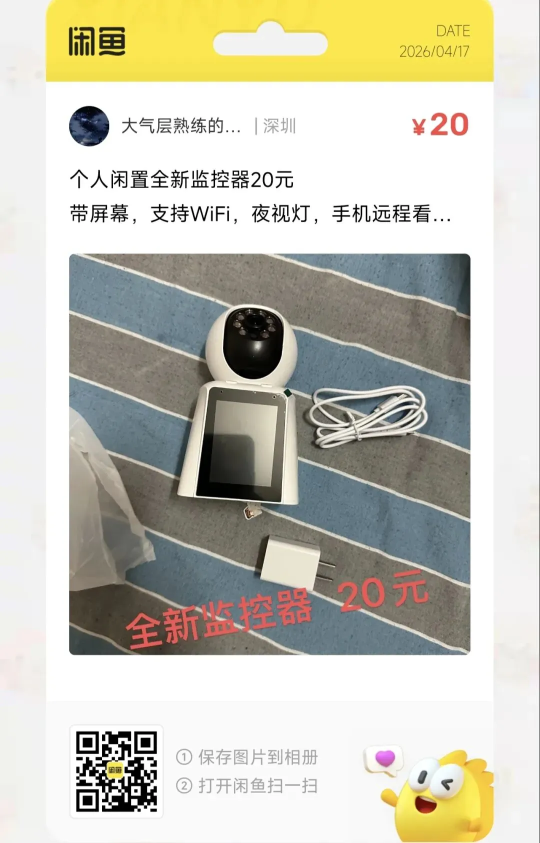 一台20元带屏幕的监控摄像头,支持WiFi,夜视灯,手机远程看家,操作简单配件齐全,插电即用