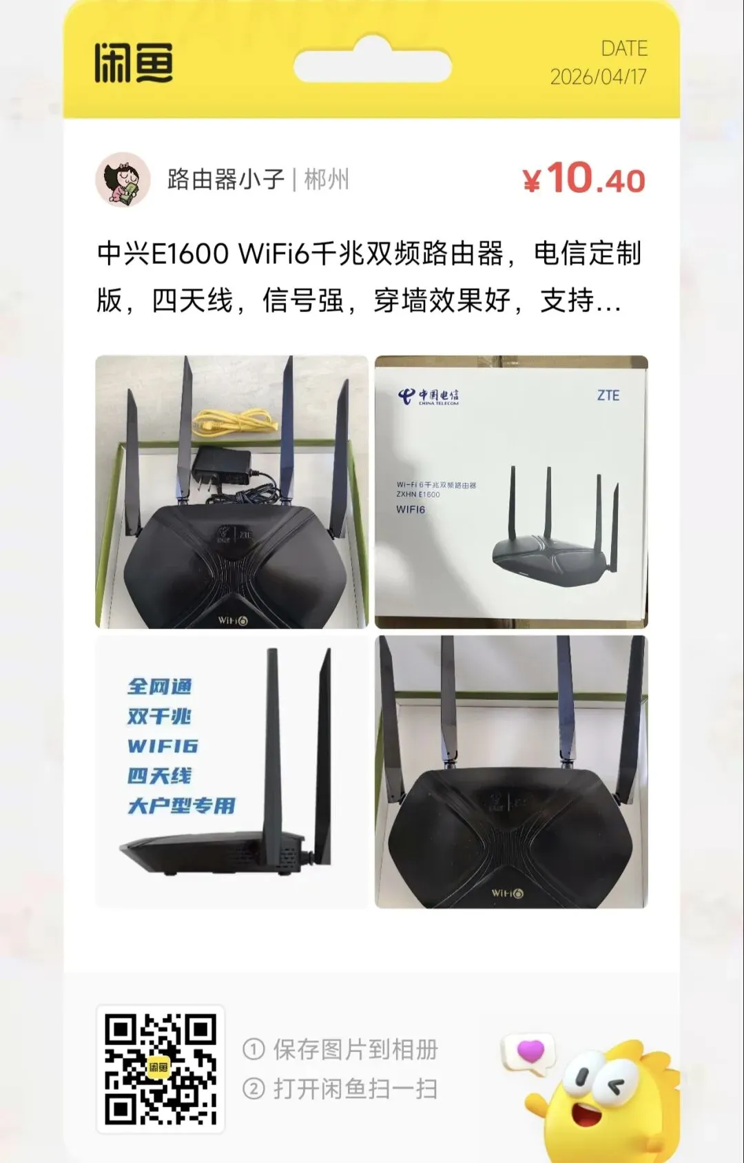 一台10元中兴E1600 WiFi6千兆双频路由器,电信定制版,四天线,信号强,穿墙效果好,支持三网通用