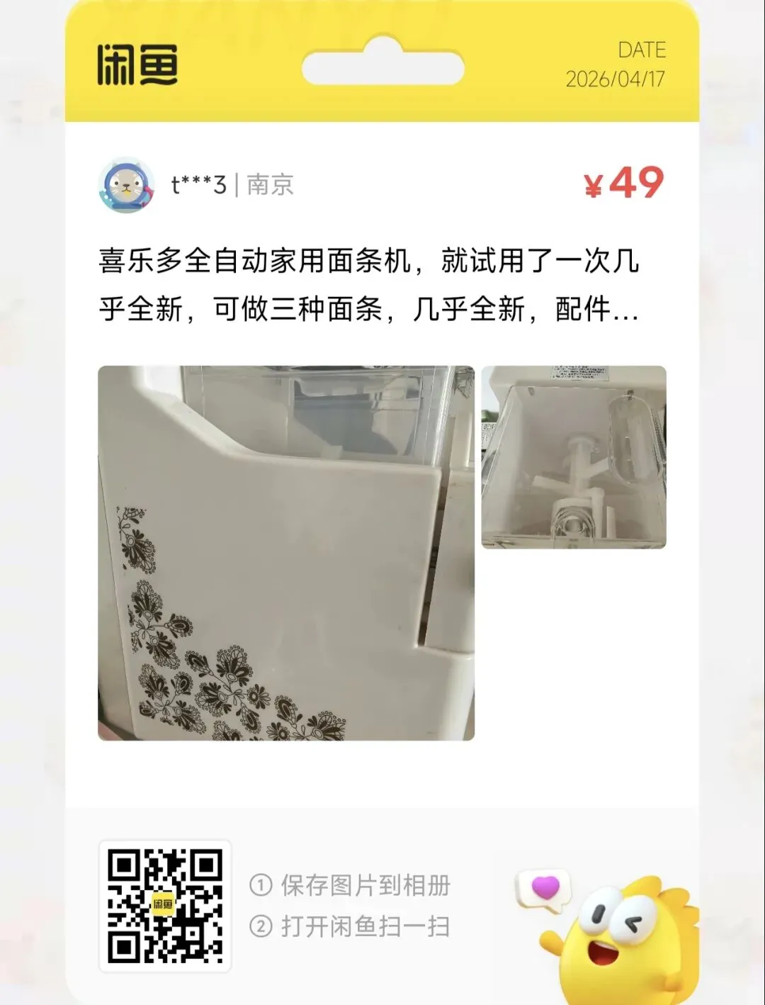 一台49元的喜乐多全自动家用面条机,就试用了一次几乎全新,可做三种面条,几乎全新,配件齐全