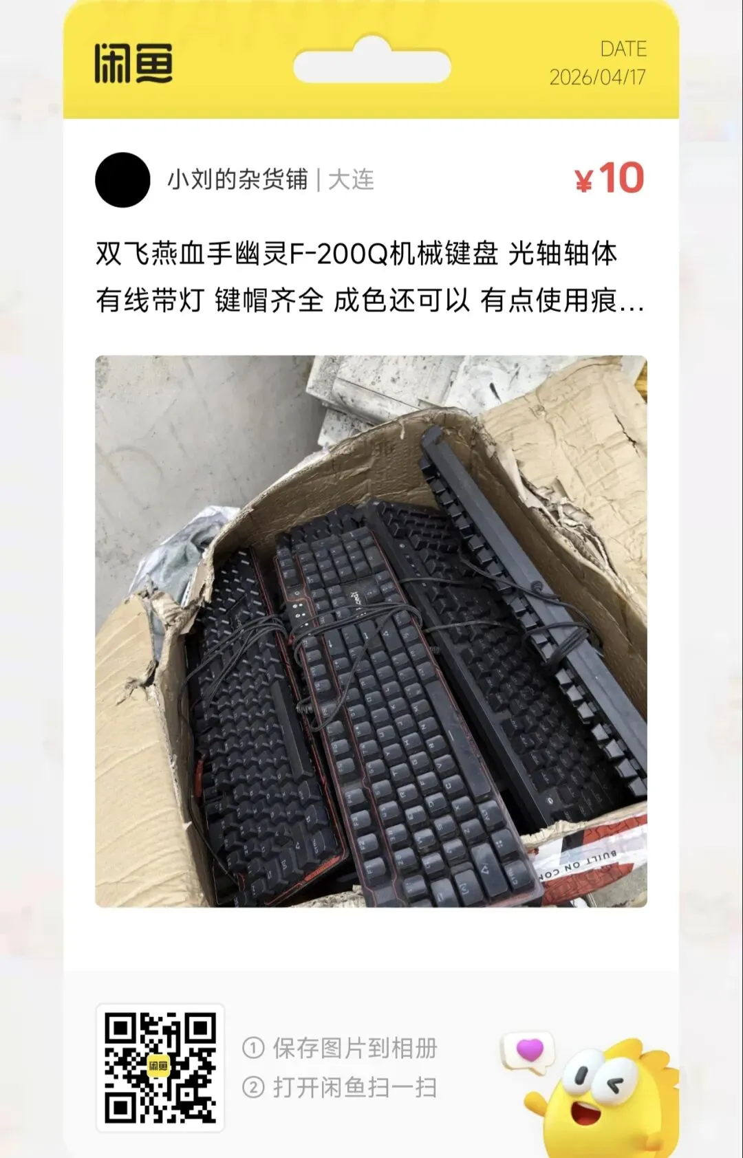 一批双飞燕血手幽灵F-200Q机械键盘 光轴轴体 有线带灯 键帽齐全 成色还可以,10元一个