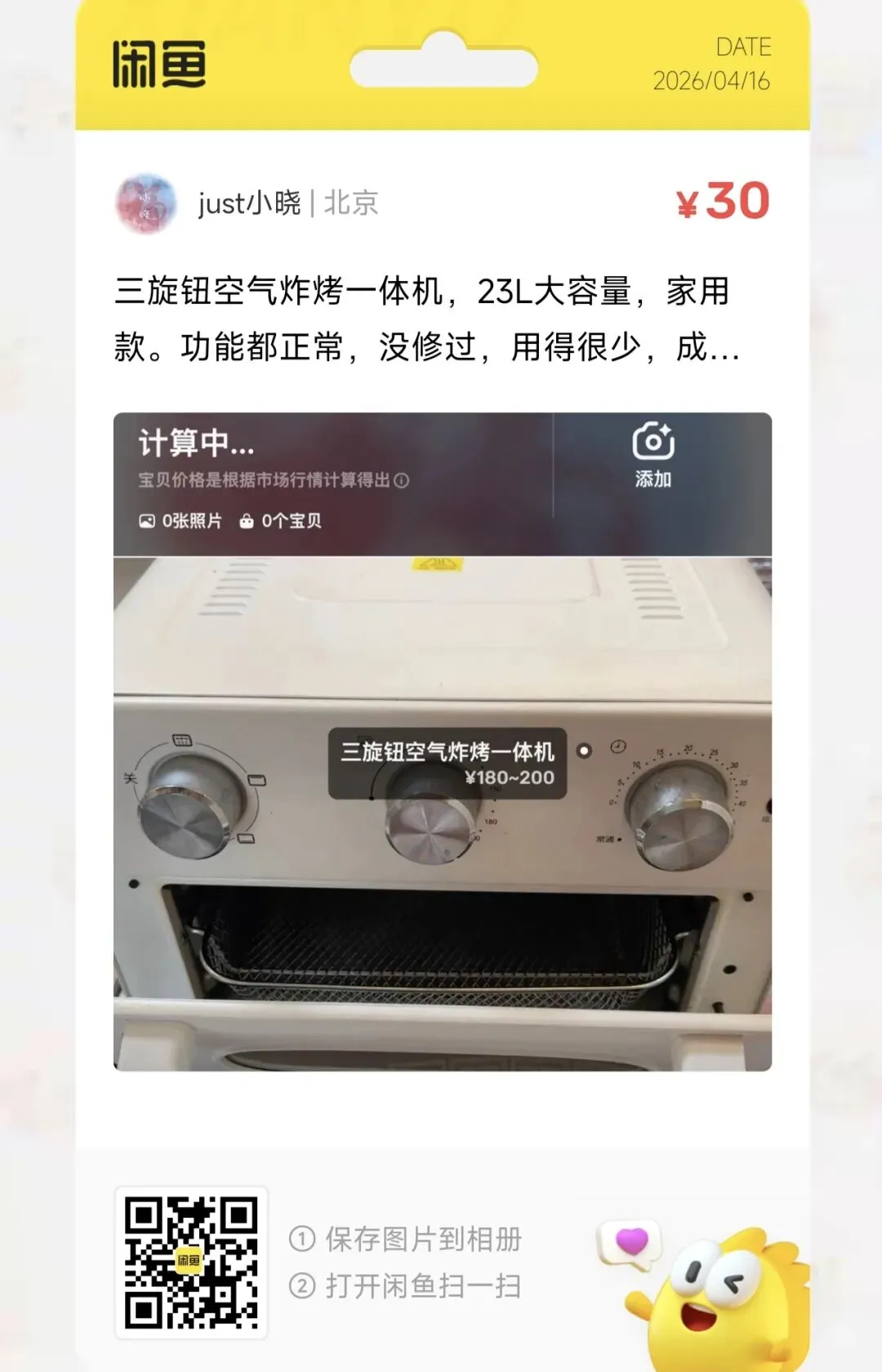 一台30元的三旋钮空气炸烤一体机,23L大容量,家用款。功能都正常