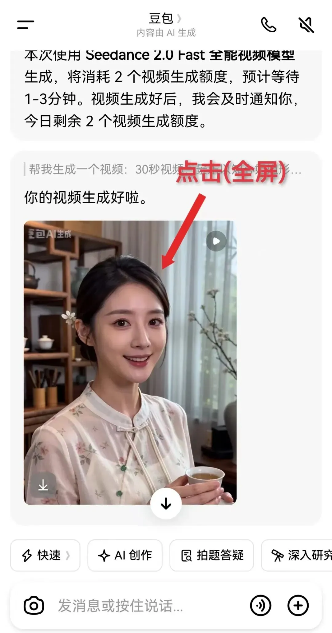 (1)在豆包app上找到需要下载的视频,点击此视频成为全屏播放状态。