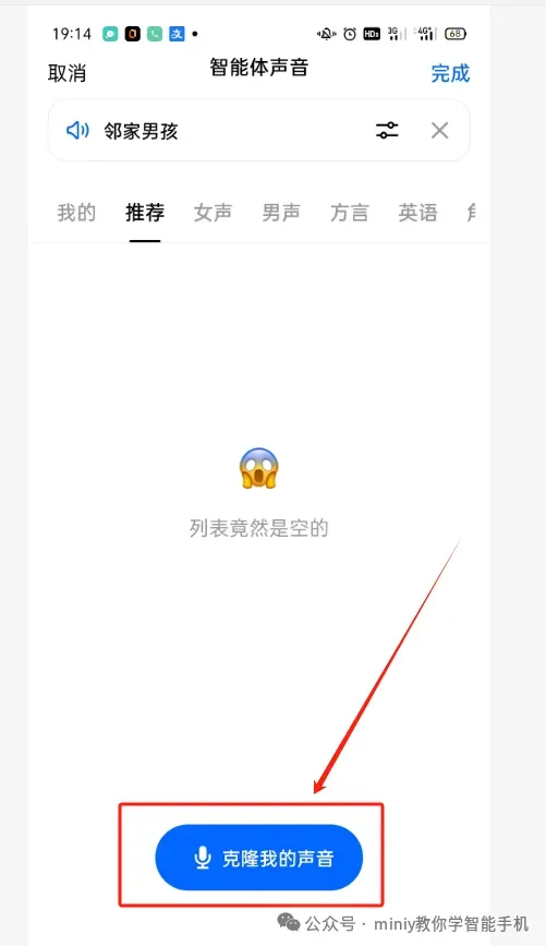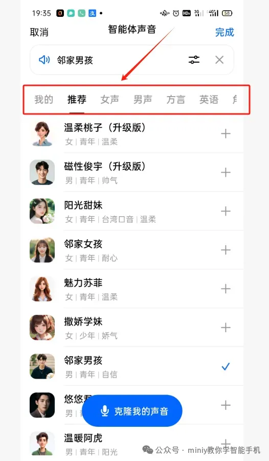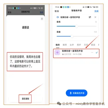 3、完成录制并确认:按照提示朗读相应文本,完成录制后确认声音,还可设置不同的音色、方言等。克隆完成后,在我的智能体声音这里就会有自己的声音,点击使用即可。