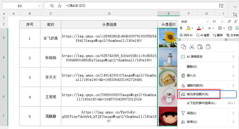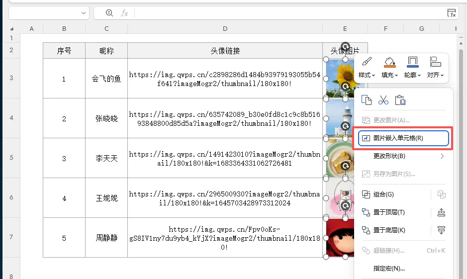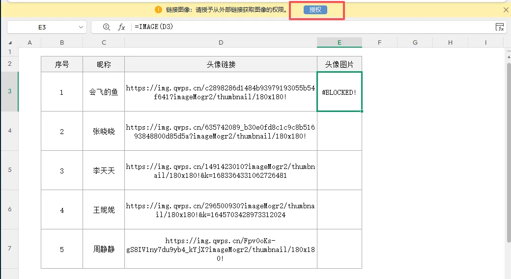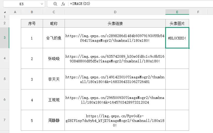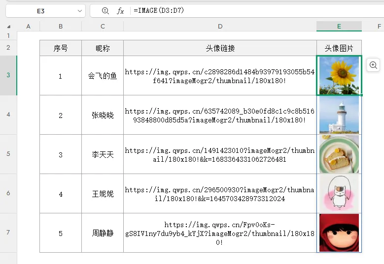 =IMAGE(D3:D7,C3:C7&”头像”)