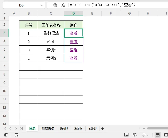 =HYPERLINK(“#”&C3#&”!A1″,”查看”)