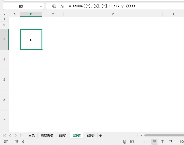 =LAMBDA([x],[y],[z],SUM(x,y,z))()
