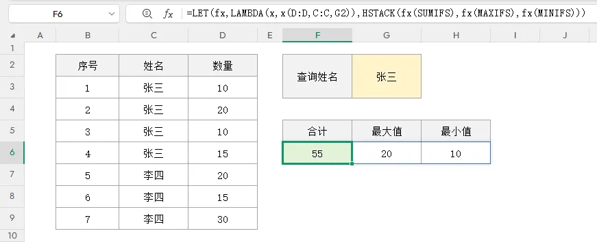 示例1、使用LAMBDA函数创建多条件查询函数,函数内给定条件,在调用时传入不同函数名称后,返回对应的统计结果。