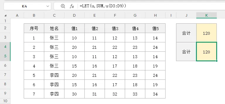 =LET(u,SUM,u(D3:D9))