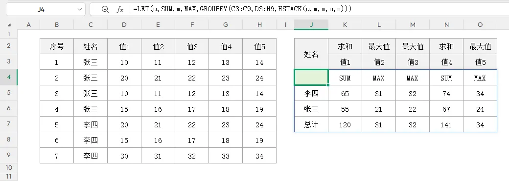 =LET(u,SUM,m,MAX,GROUPBY(C3:C9,D3:H9,HSTACK(u,m,m,u,m)))