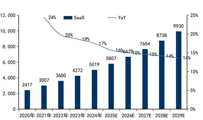 事实上,以北美为主导的全球软件产业体量庞大,当前产值已接近 5000 亿美元,IDC 更是预测2029 年全球 SaaS 市场规模将逼近 1 万亿美元。但这片广阔的增量市场,正面临被 AI 原厂分食的局面。