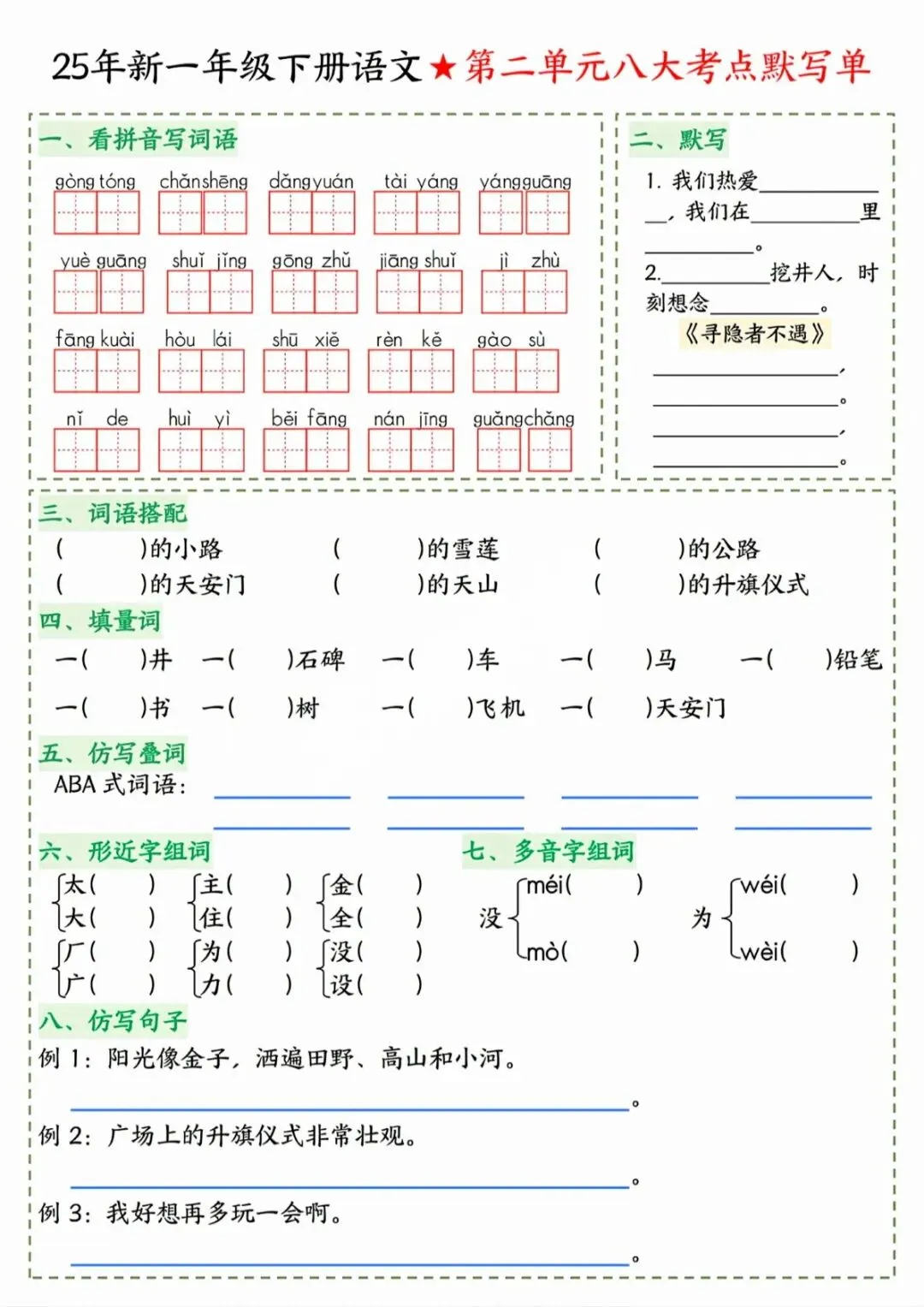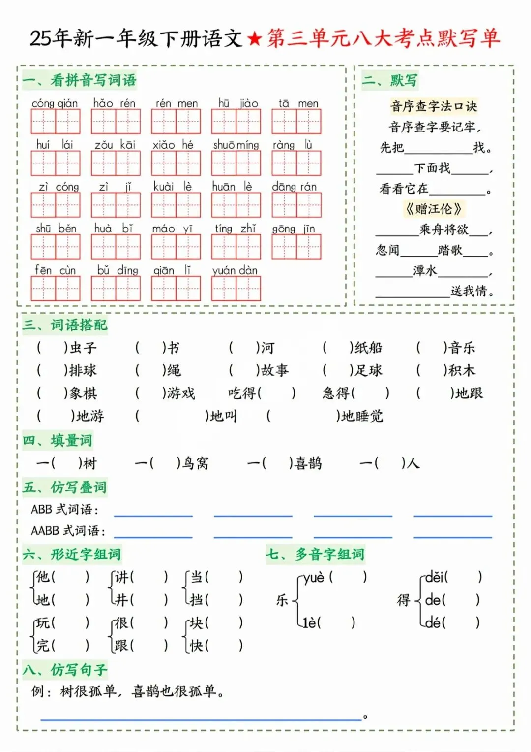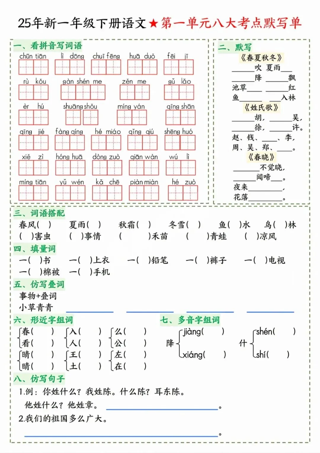一年级下语文八大考点默写单 电子版可打印