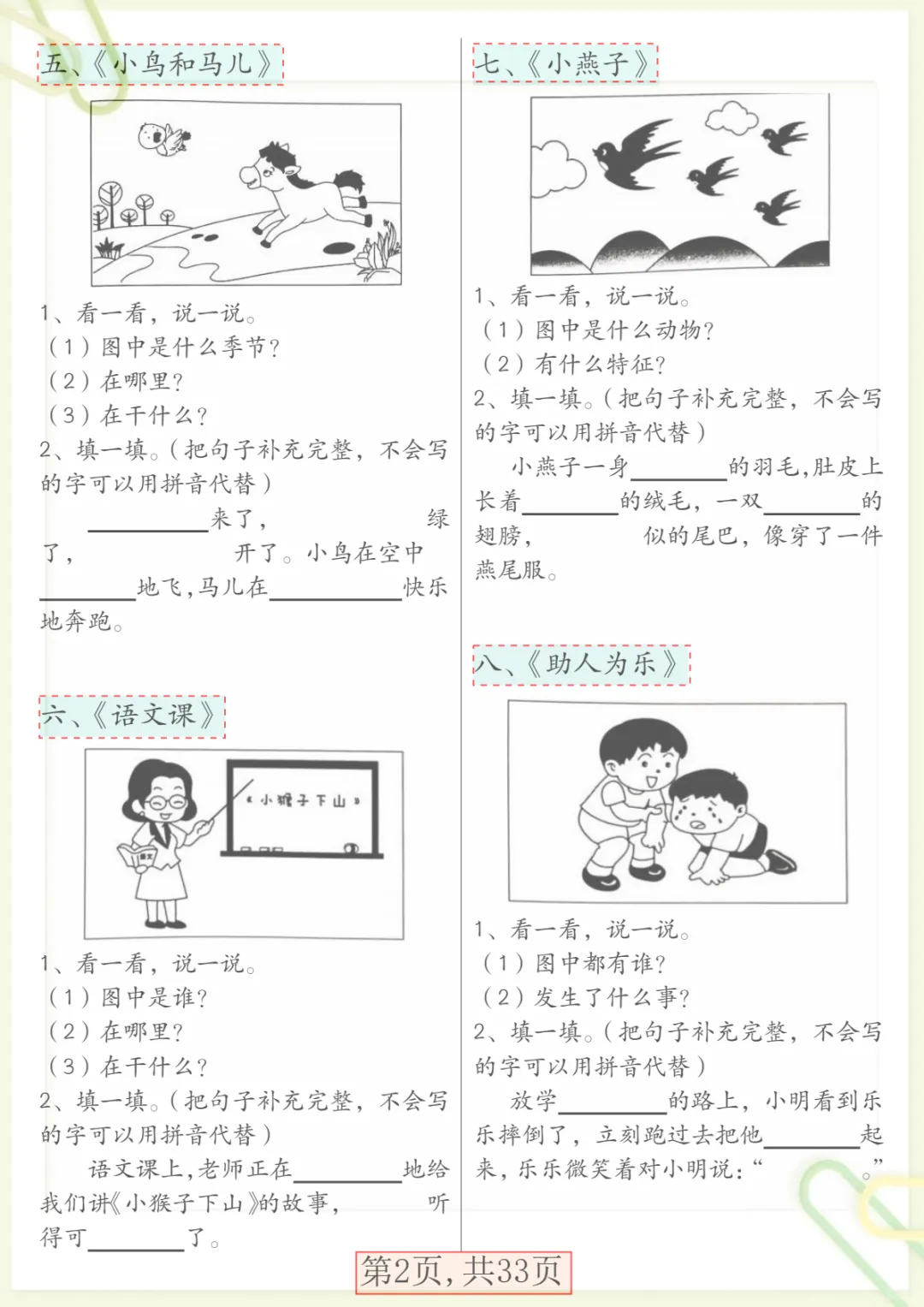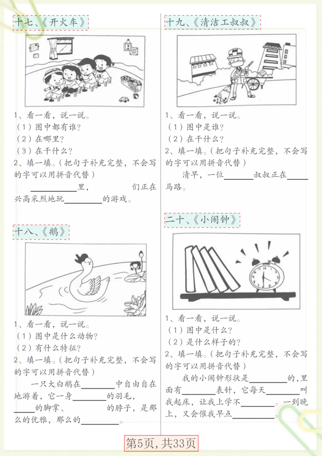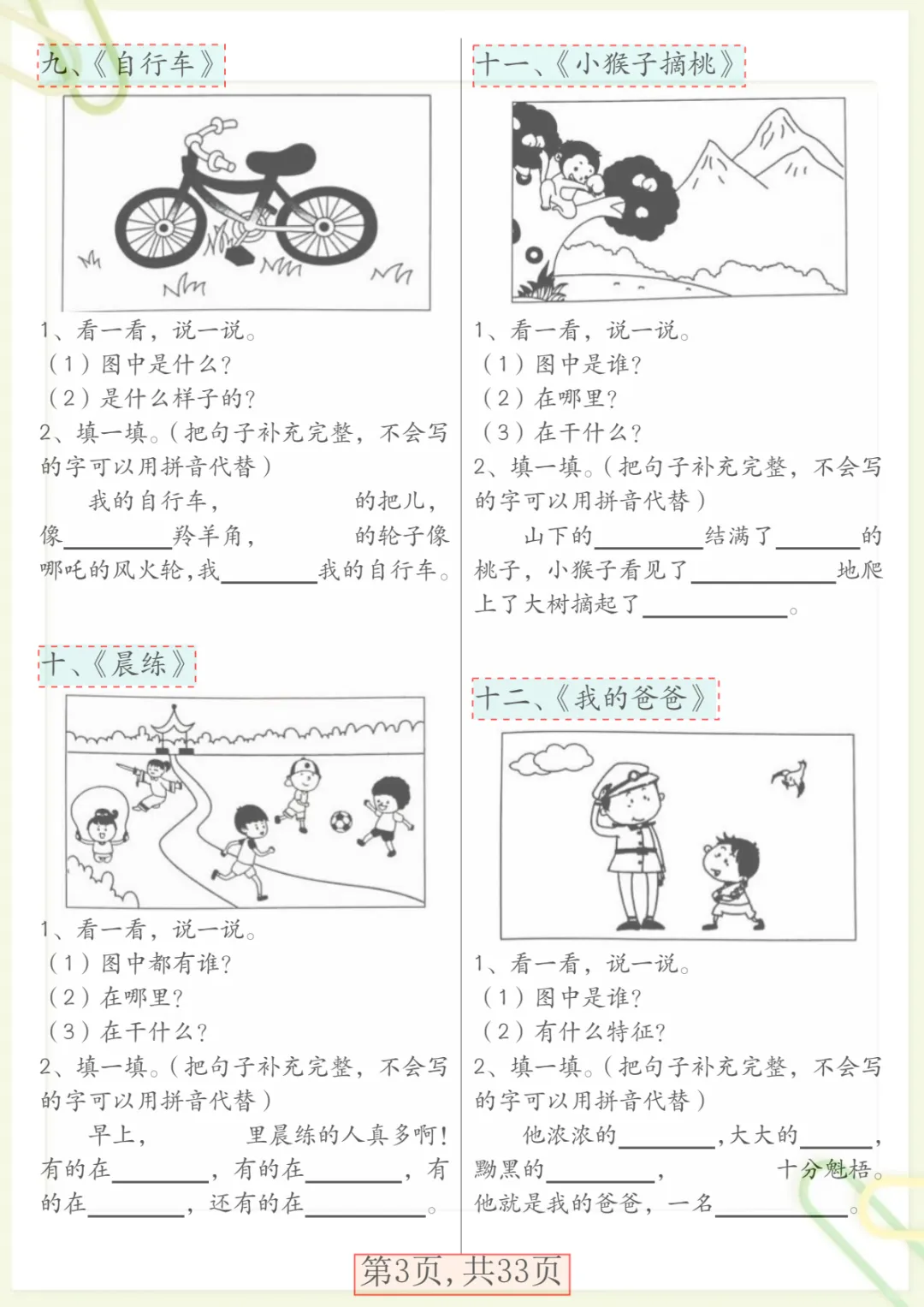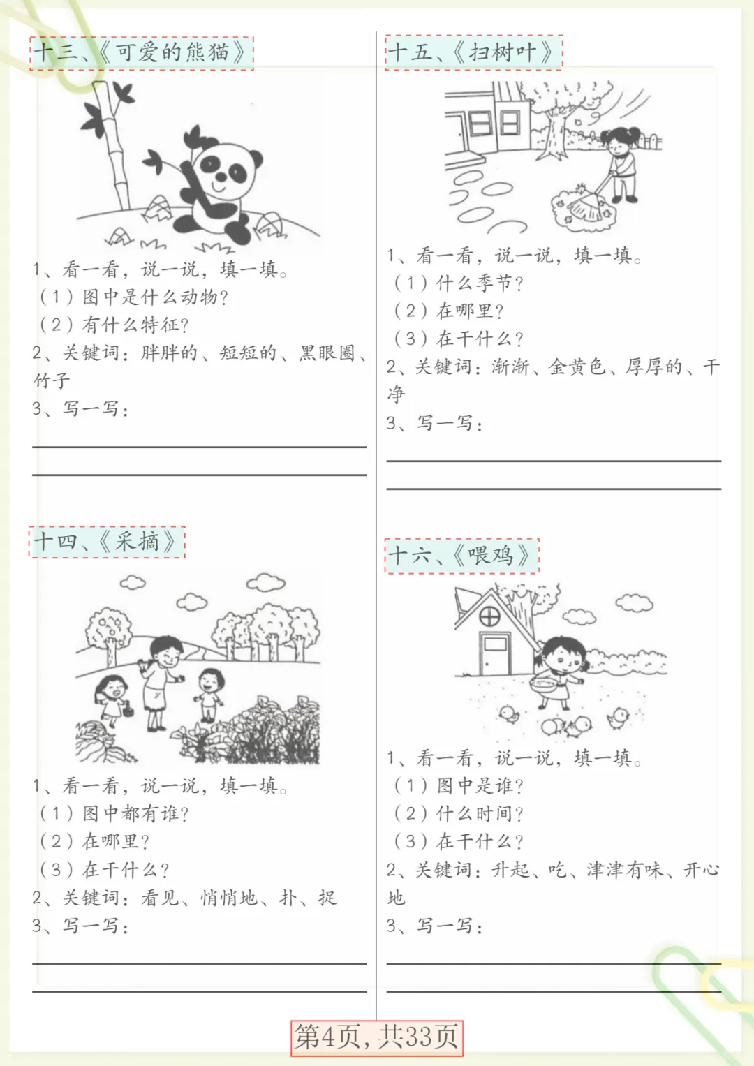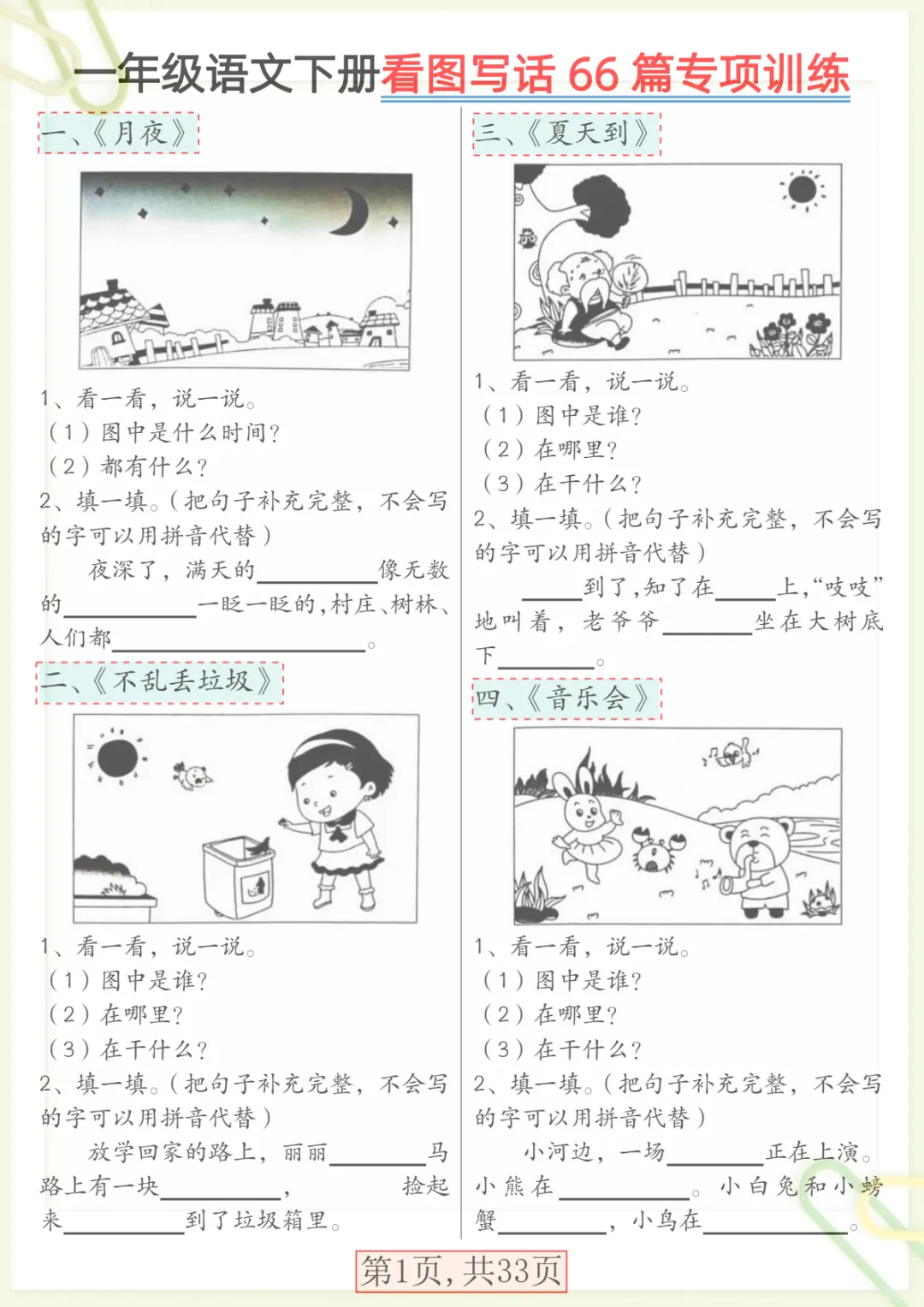 【看图写话66篇专项训练】一下语文,共33页,电子版可下载可打印,这份一年级语文专项练习紧扣看图写话训练,围绕观察图片、理解画面内容、组织语言、规范表达、完整成句成段等基础能力展开,帮助孩子在练习中逐步掌握写话思路,提升语文表达与写作启蒙能力。内容实用、训练集中,适合家长给孩子日常巩固与课后练习,需要的家长可以抓紧下载打印出来,让孩子练一练。