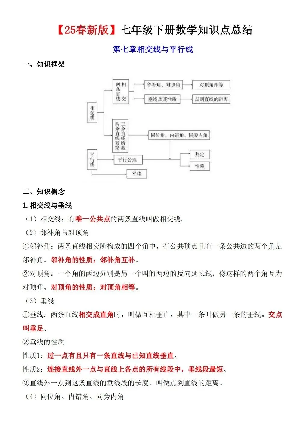 2026版七年级下册数学知识点背记总结笔记,可打印电子版!