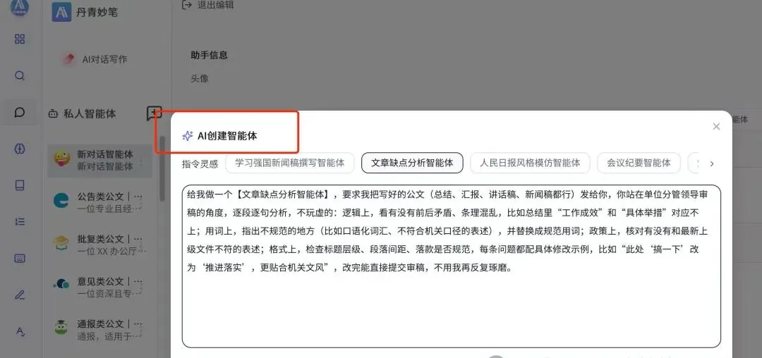 做体制内文秘工作5年,写材料最头疼的不是“写不出”,而是“写不贴合”——要么不符合单位行文风格,要么找不到贴合工作实际的素材,要么每次写都要重新翻找政策文件、历史文稿,耗时又费力。之前试过不少写作AI,大多是“千人一面”的通用模板,没法适配个人和单位的专属需求,直到用上丹青妙笔,才真正感受到“专属AI助手”的便捷,尤其是它的私人智能体+知识库功能,再搭配19大公文辅助功能,彻底解决了我写材料的核心痛点,今天就以真实用户视角,聊聊它到底有多懂职场人的写作需求。
