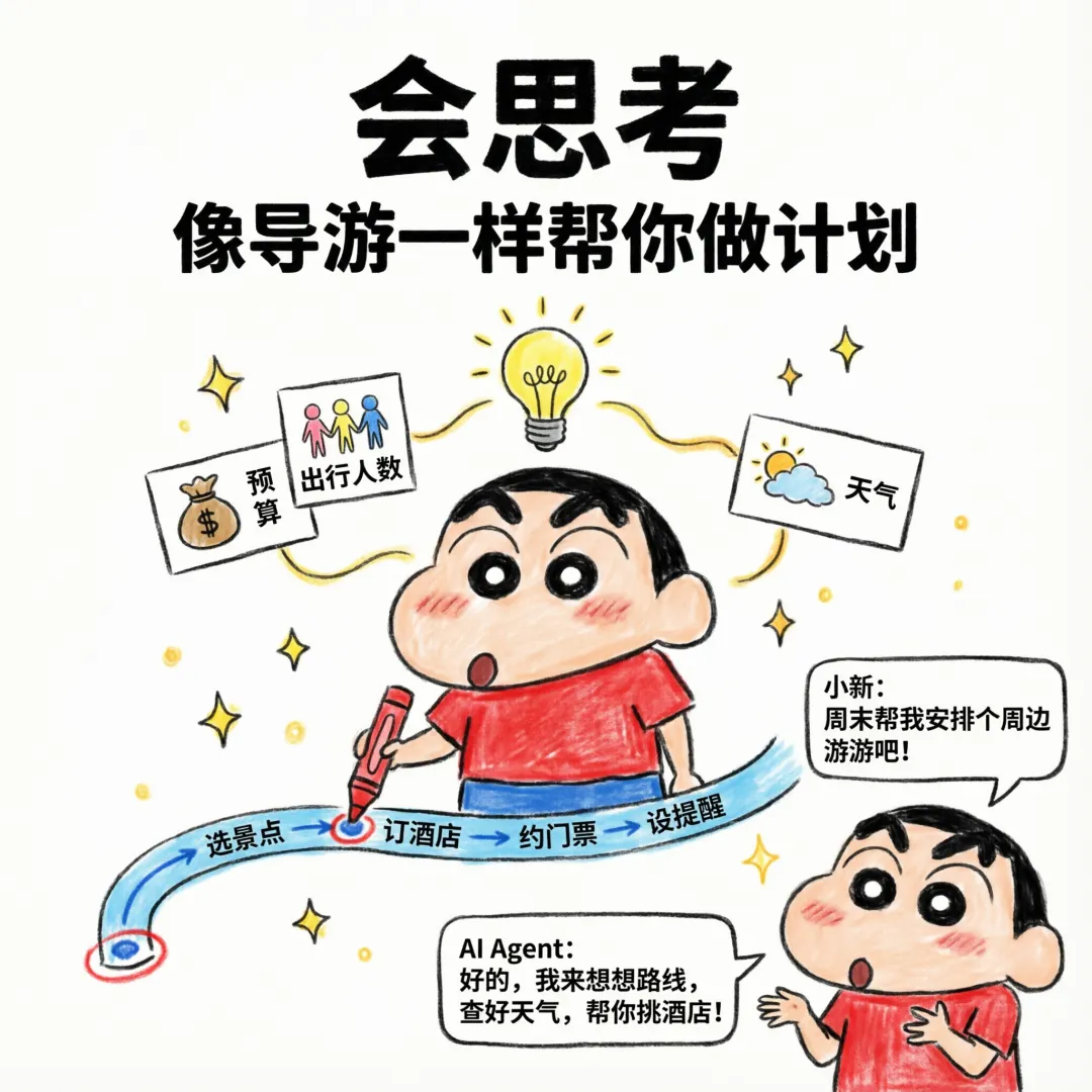 AI Agent的”大脑”会把你的一句话需求拆成一步步计划,就像经验丰富的旅行导游,从你的预算和喜好出发,一步步安排好所有细节。你说”帮我安排一场周末周边游”,普通AI只会推荐景点和酒店;而AI Agent会自动分析你的预算、出行人数、天气情况,一步步规划路线、筛选酒店、预约门票、提醒出行时间,全程不用你反复下指令。