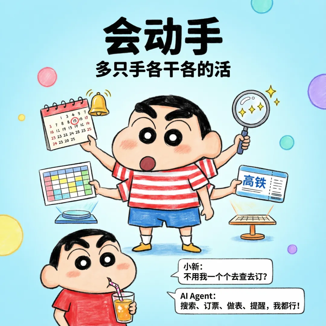 AI Agent的”双手”能直接操作各种软件工具,它像是有好几只手同时干活,你不用在各个App之间来回切换,它帮你一键搞定所有操作。AI Agent通过工具链集成,可以像人一样操作各类软件:查信息用搜索引擎、订车票用出行平台、做表格用办公软件、发提醒用日历工具,不用你手动切换操作,它能自主调用对应工具,把想法变成实际行动。