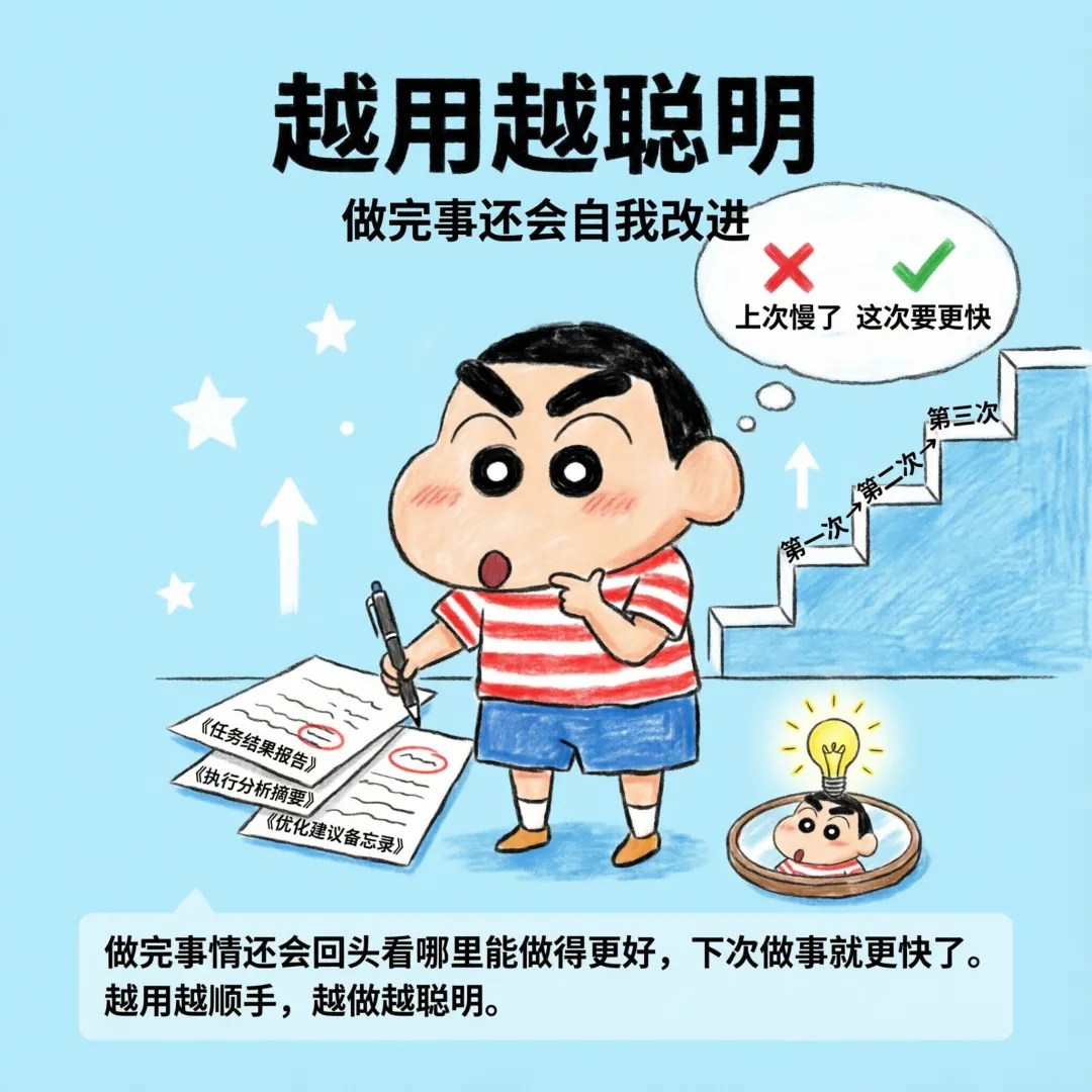 AI Agent完成任务后会自我检查和改进——就像人做完一件事会复盘一样,它会总结经验教训,下次遇到类似任务时做得更快更准。完成任务后,AI Agent会通过自我优化机制,判断任务是否达标、有没有更优方案。如果出现失误,会自动总结原因、修正逻辑,下一次执行同类任务时,效率和准确率更高,不用你手动调教。
