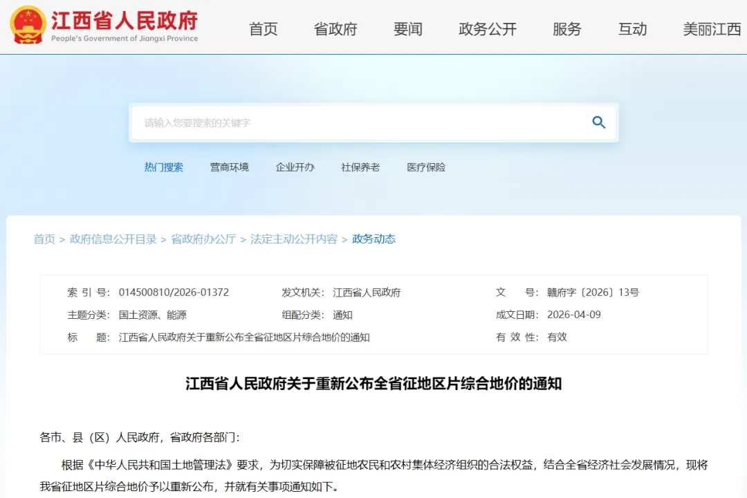 重磅发布!2026版江西省人民政府关于重新公布全省征地区片综合地价的通知,4月21日起执行(附征地文件下载)