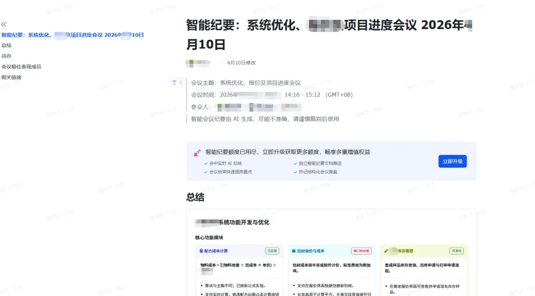 会议纪要也非常专业,生成的会议纪要结构化非常清楚。