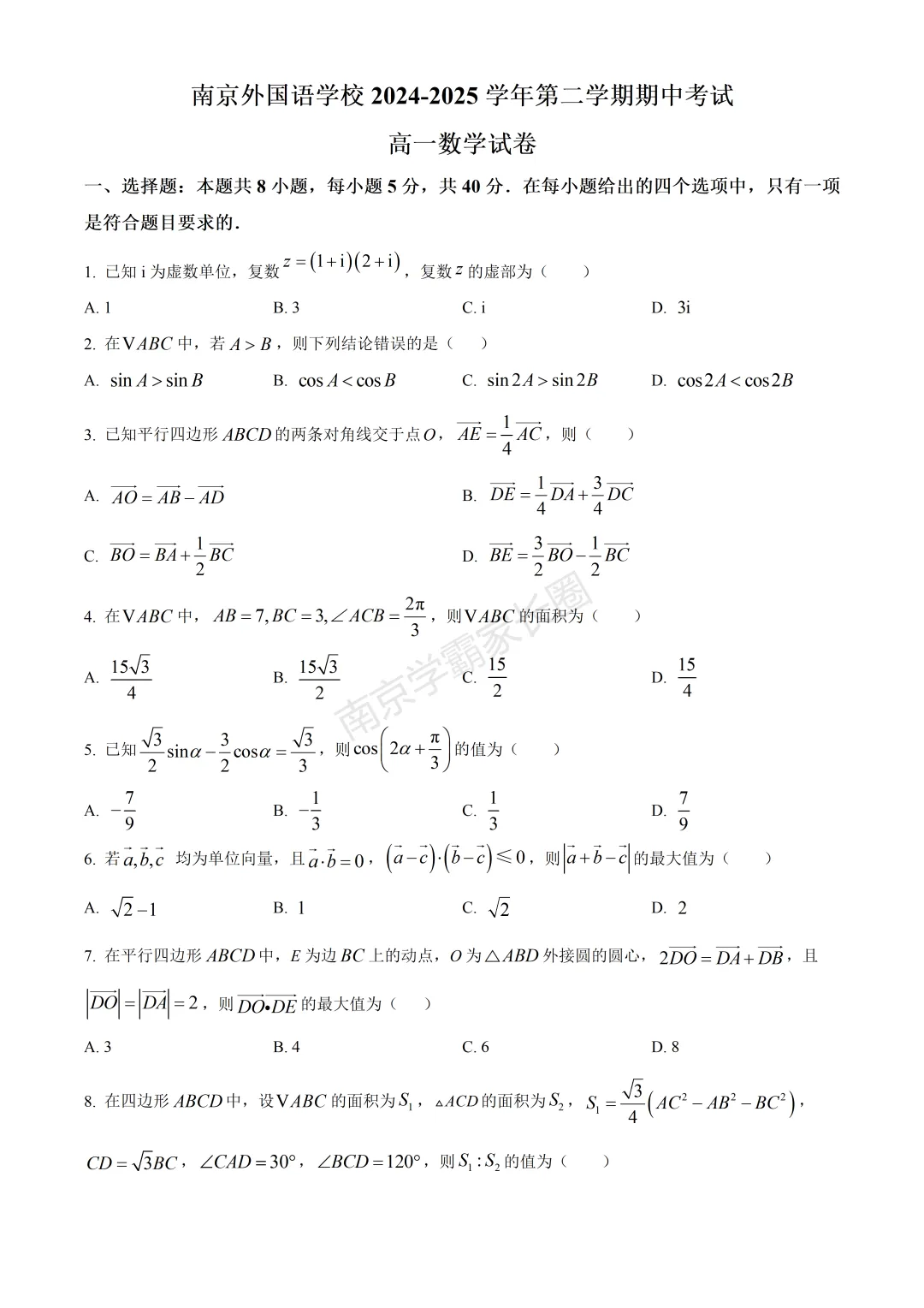 完整版可打印!南京外国语学校24-25年下学期期中考试数学试卷!