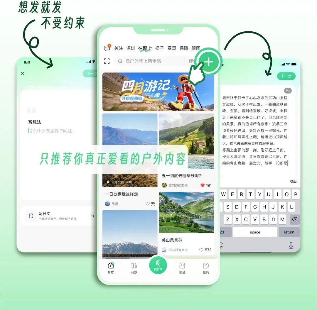这里只推荐你真正爱看的户外内容 —— 徒步游记、山野攻略、出行打卡、优质动态,基于你的户外偏好匹配,越刷越懂你。轻松与全国同频户外爱好者交流心得、分享感动📝。