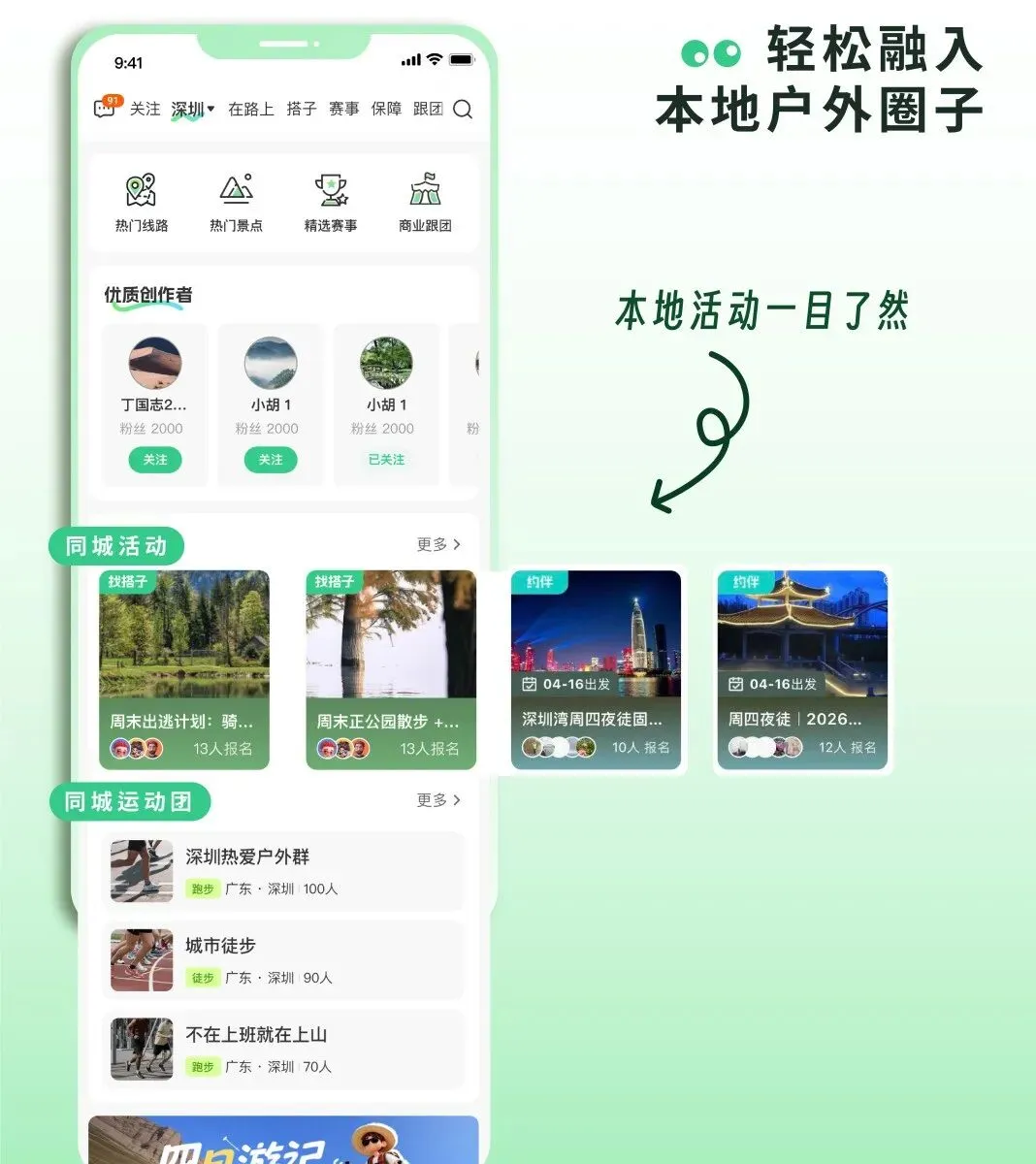全新升级的同城频道,更是本地户外爱好者的福音。一站式聚合同城热门线路、网红景点、精选赛事、商业跟团、约伴搭子、优质户外创作者、本地运动团全资源,精准匹配周边出行需求。