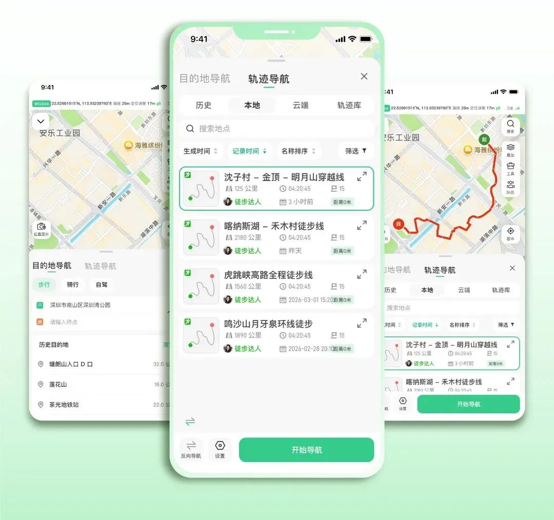 轨迹导航优化选线流程,新增历史轨迹页签,本地、云端、轨迹库路线一键调取;导航状态支持下拉最小化,关键信息不遮挡地图,野外循迹更安心、更放心。