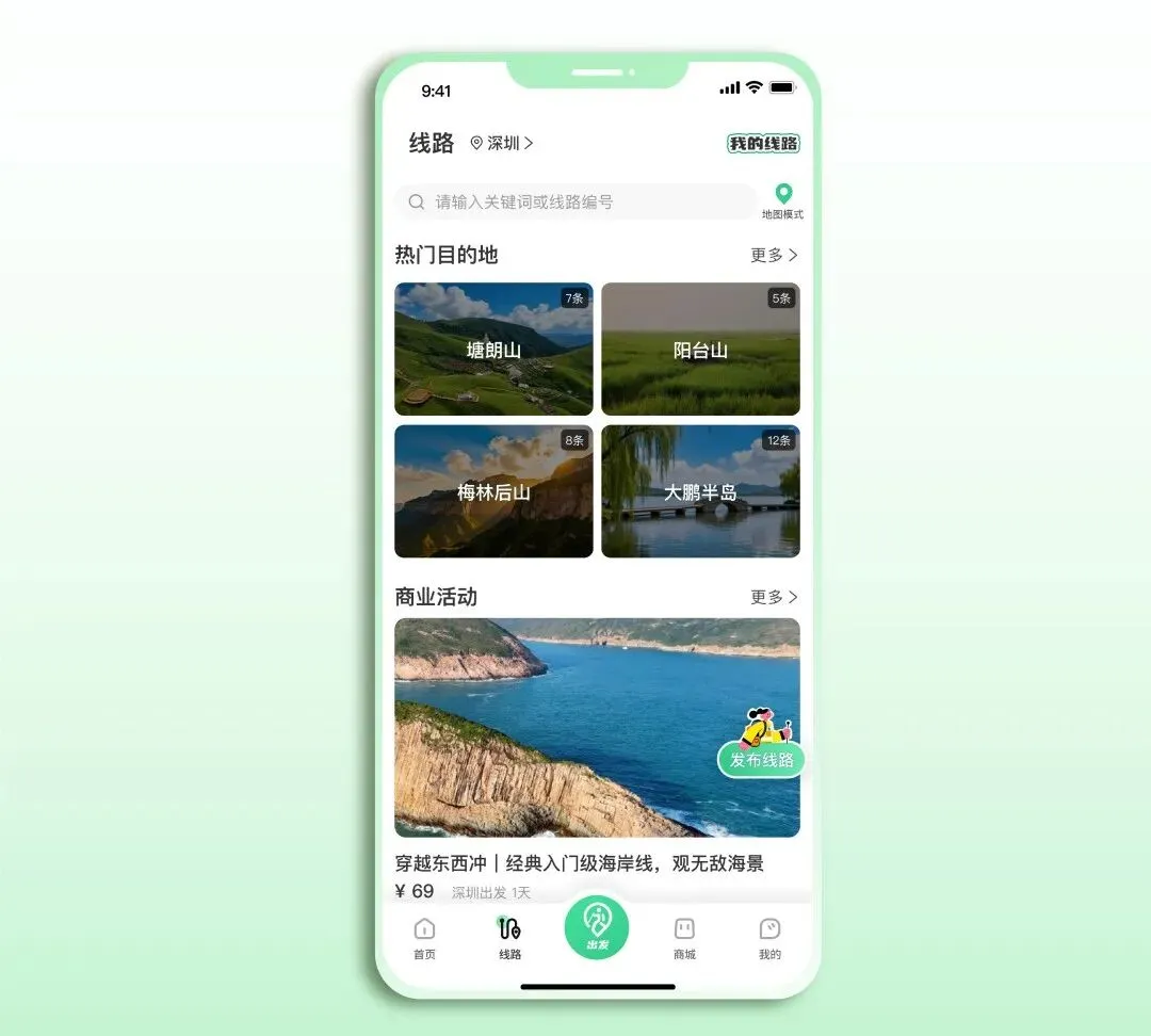 找路线不用东翻西找,底部一键直达,打开就能精准发现适合自己的户外好线!