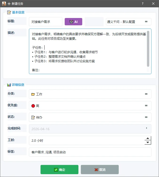 创建任务时,只需要写个标题,比如”对接客户需求”,点一下 AI 按钮,它就帮我补全: