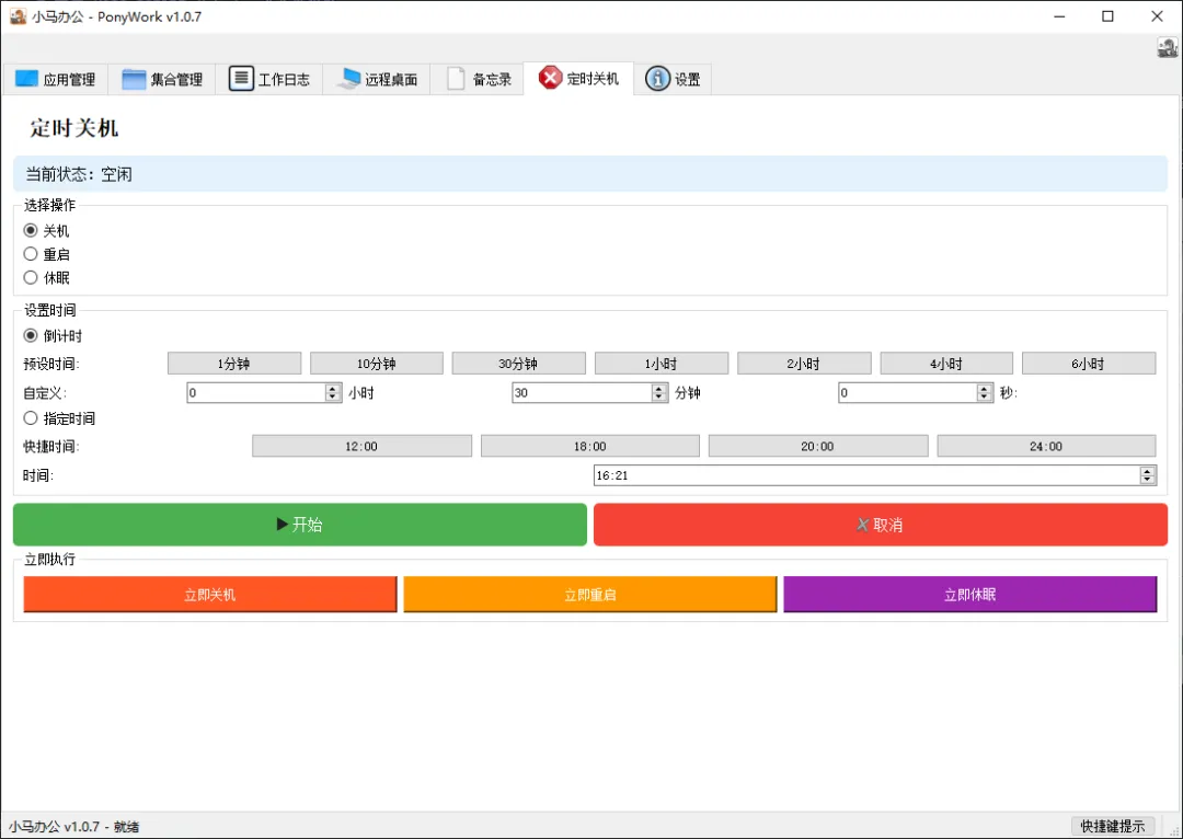 小马办公支持定时关机、重启、休眠,可以设置具体时间,也可以选”下班后 X 小时自动执行”。
