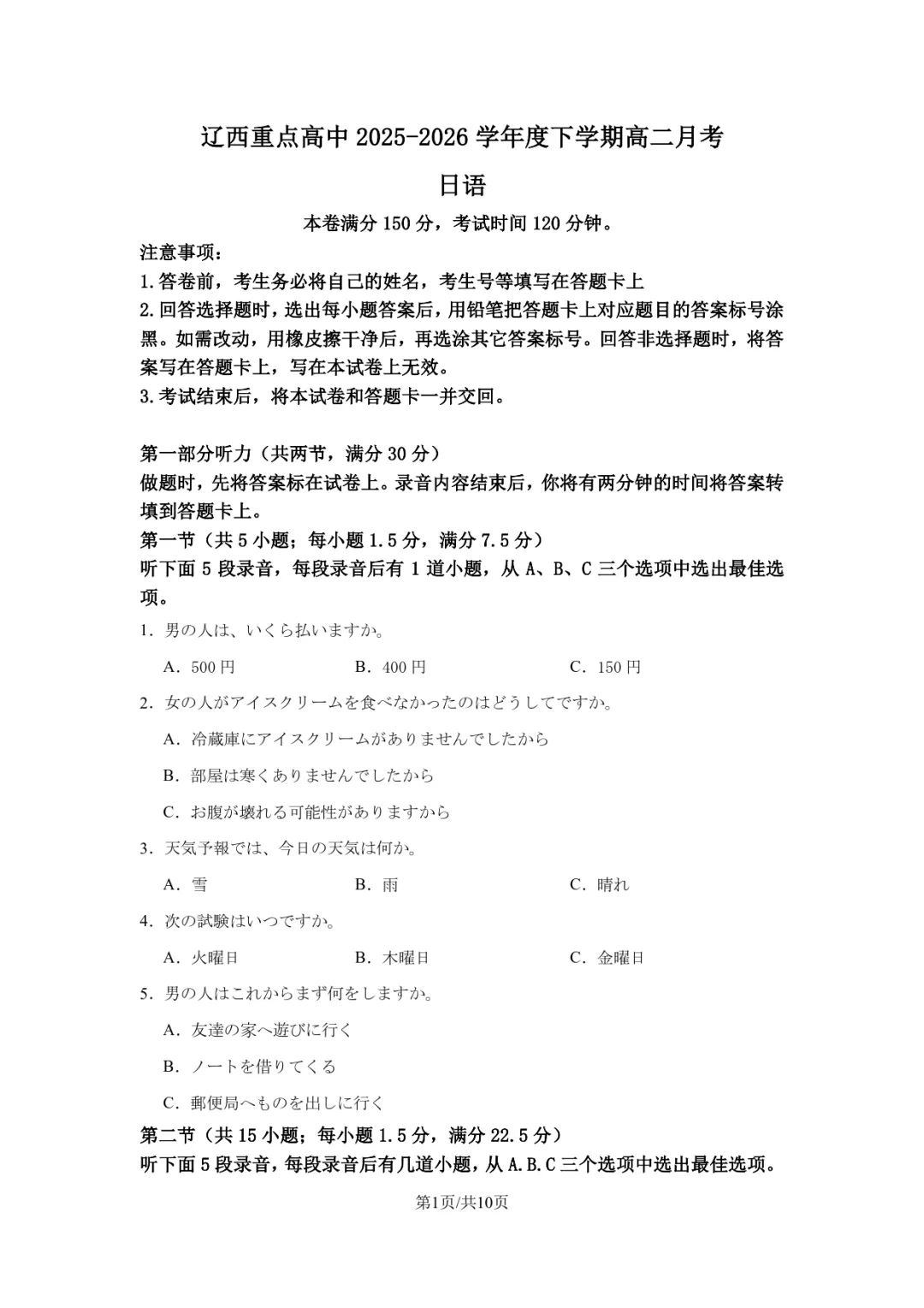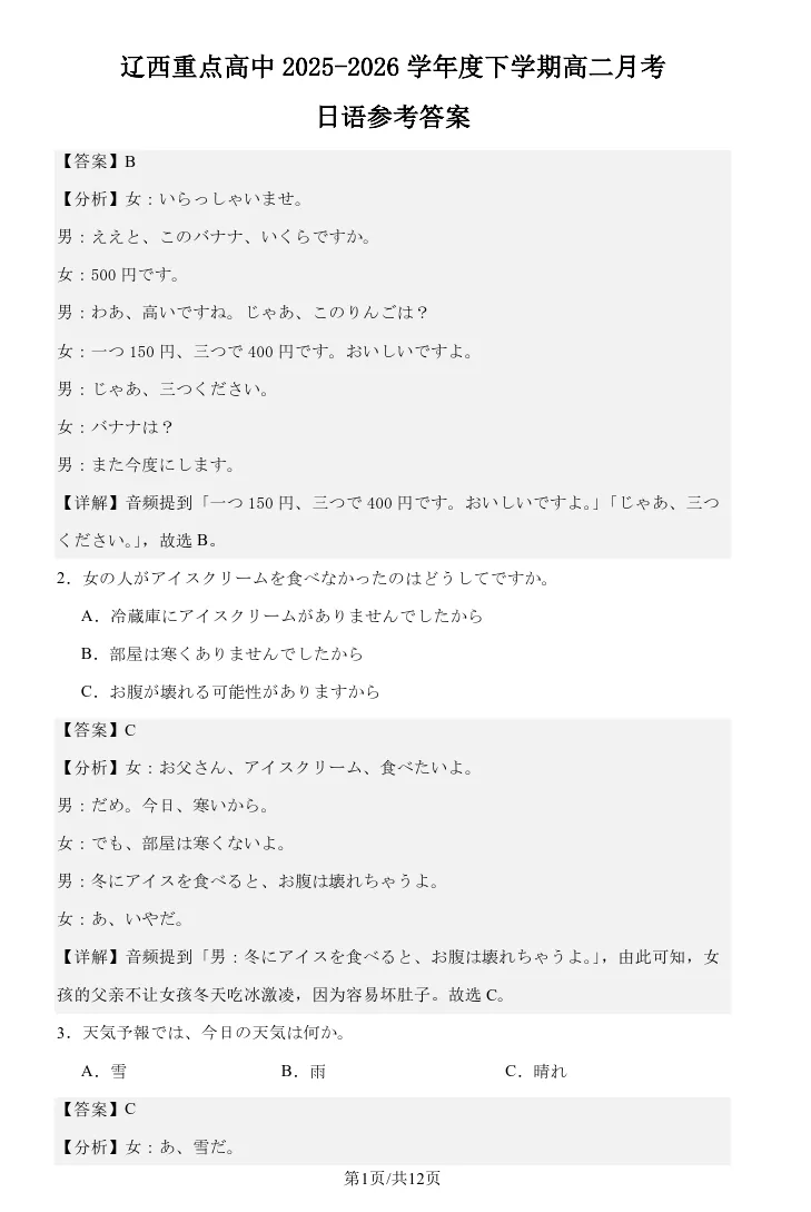 高二4月日语word/PDF|辽宁辽西重点高中2025-2026学年度下学期高二4月月考日语试卷-听力-答案-勇桑日语