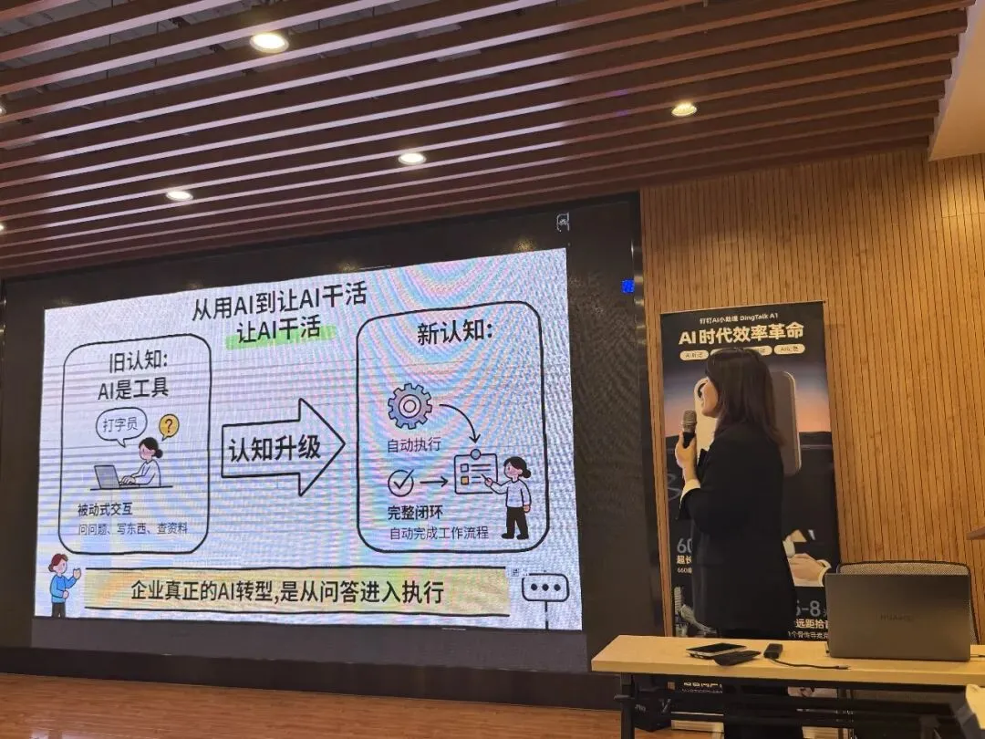 在她看来,大多数企业的 AI 应用仍停留在「打字员」阶段——被动式交互,人提问、AI 回答。而真正的 AI 转型,是让 AI 从问答走向自动执行,实现完整的工作流闭环。