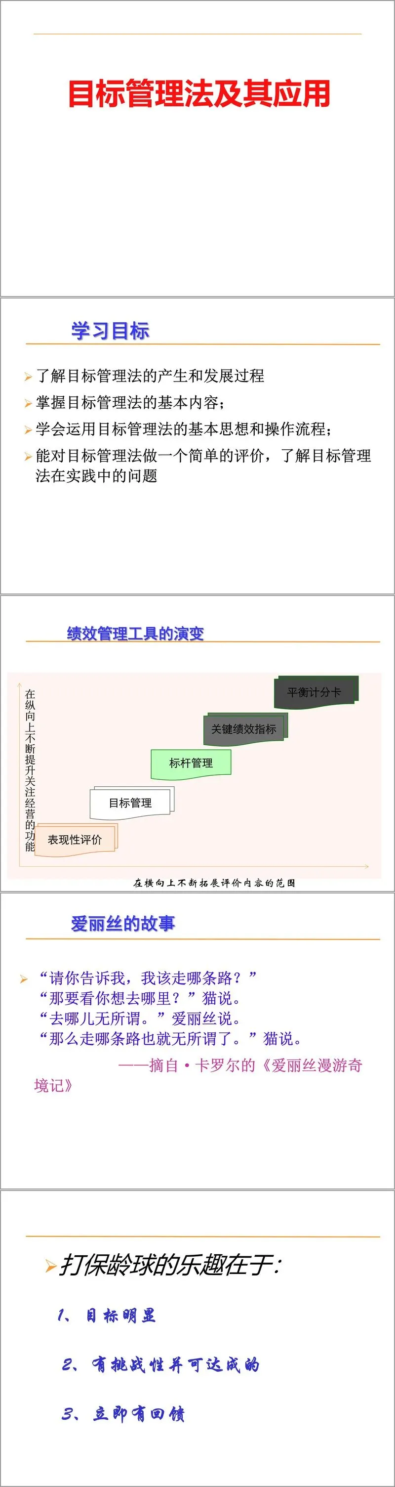 文件开篇明确学习目标,要求学习者掌握目标管理法的起源、核心内容、操作流程与实践评价,同时梳理了绩效管理工具的演进脉络,从表现性评价、目标管理、标杆管理、关键绩效指标到平衡计分卡,纵向强化经营导向,横向拓展评价维度,以爱丽丝问路与打保龄球的案例,点明目标清晰、可达成、有反馈的核心价值。