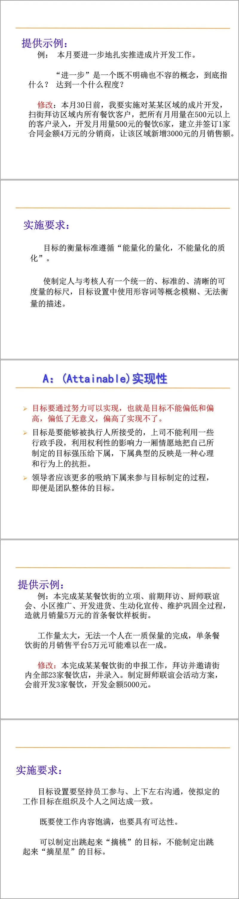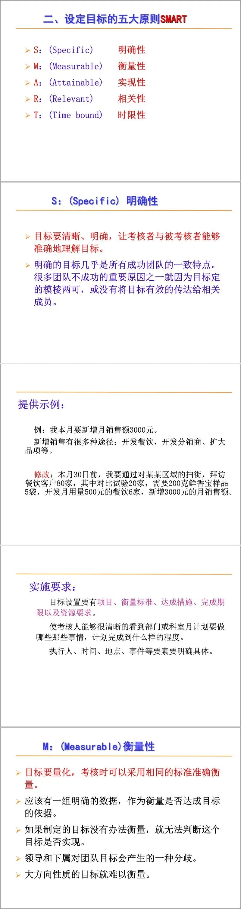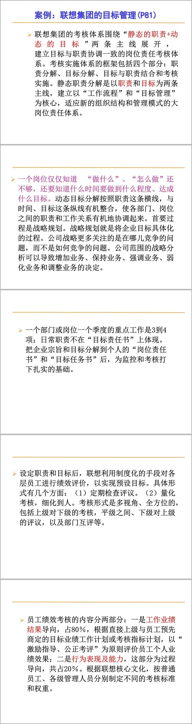 目标设定遵循 SMART 五大原则,即明确具体、可衡量、可实现、相关联、有时限,同时给出设立目标的七个步骤,从理解公司总目标、制定符合原则的分目标,到校验一致性、预判问题、匹配资源、确定完成期限,形成闭环流程。文件结合联想集团案例,说明企业以 “静态职责 + 动态目标” 搭建考核体系,将战略分解至岗位,通过定期检查、量化考核、绩效面谈与结果应用,实现目标落地与员工激励。