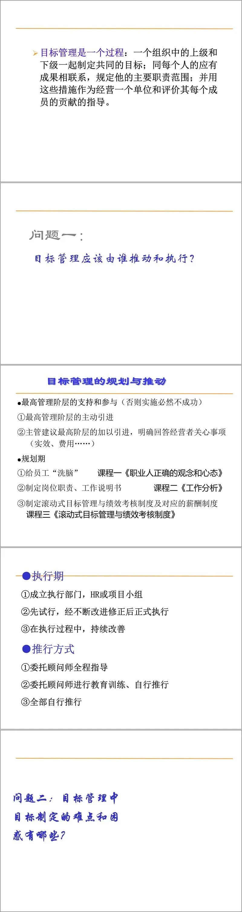 目标管理法由彼得・德鲁克于 1954 年提出,核心是将目标管理与自我控制结合,激发员工潜能。文件通过实验证明,明确目标能显著提升绩效,其本质是上下级共同制定目标、界定职责、以成果为导向的管理过程。推行需高层全力支持,历经规划、执行阶段,通过培训、制度建设、试点优化保障落地。