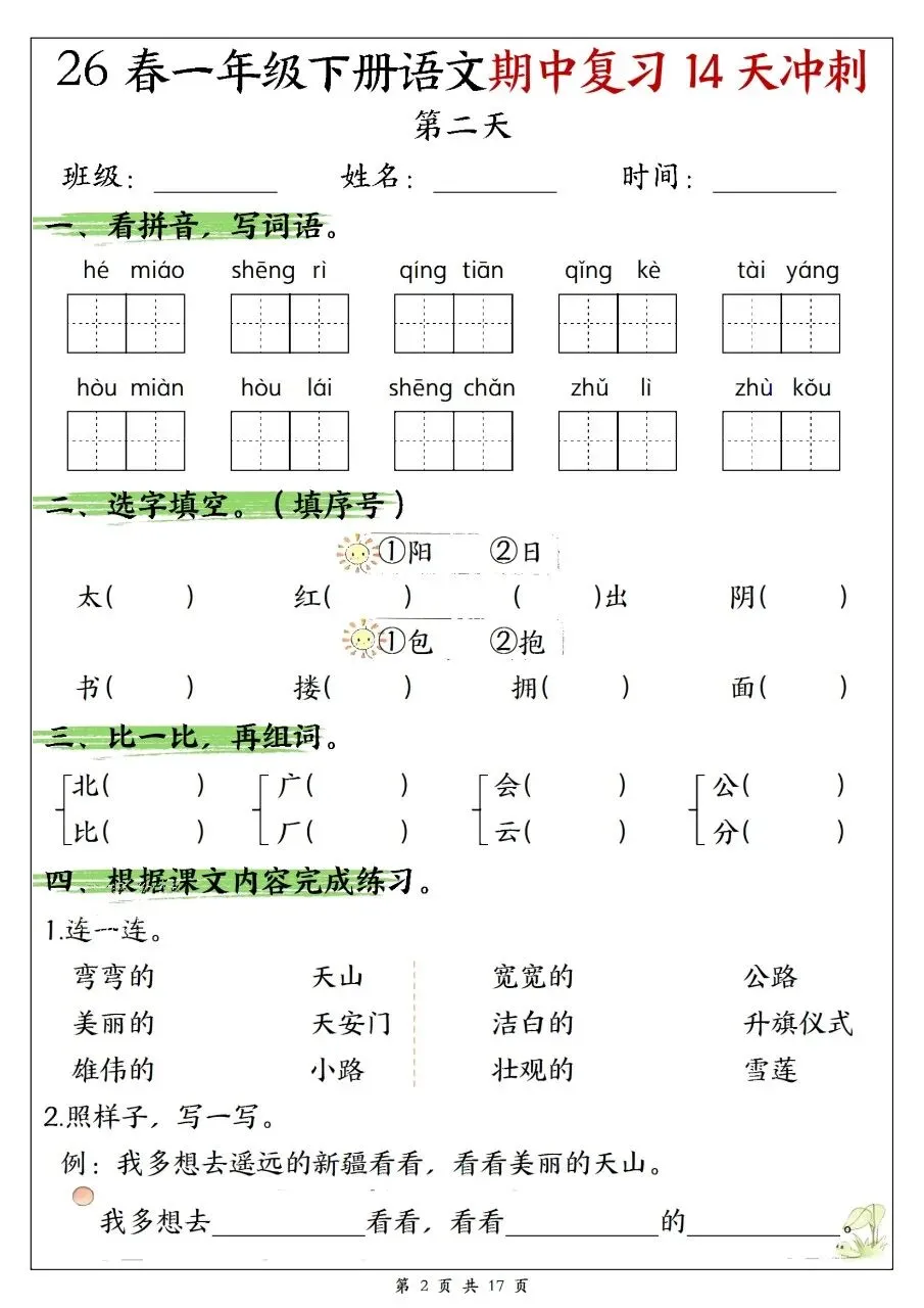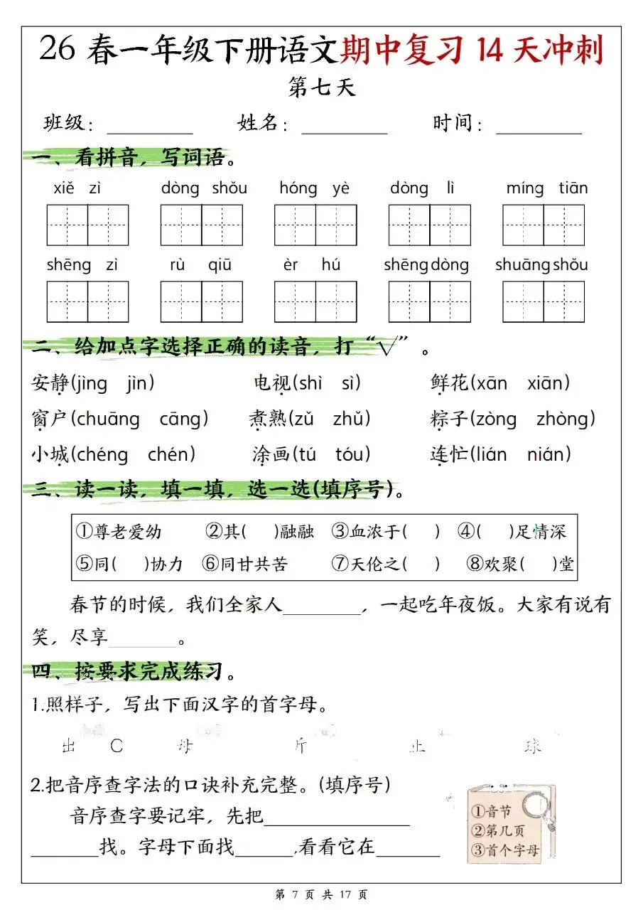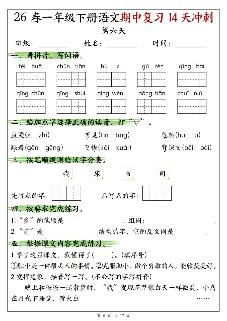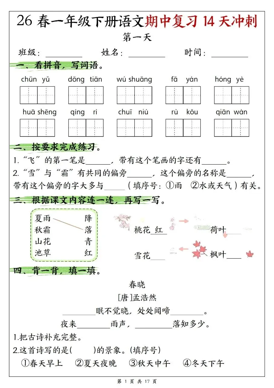 一年级下册语文期中复习14天冲刺含答案可打印