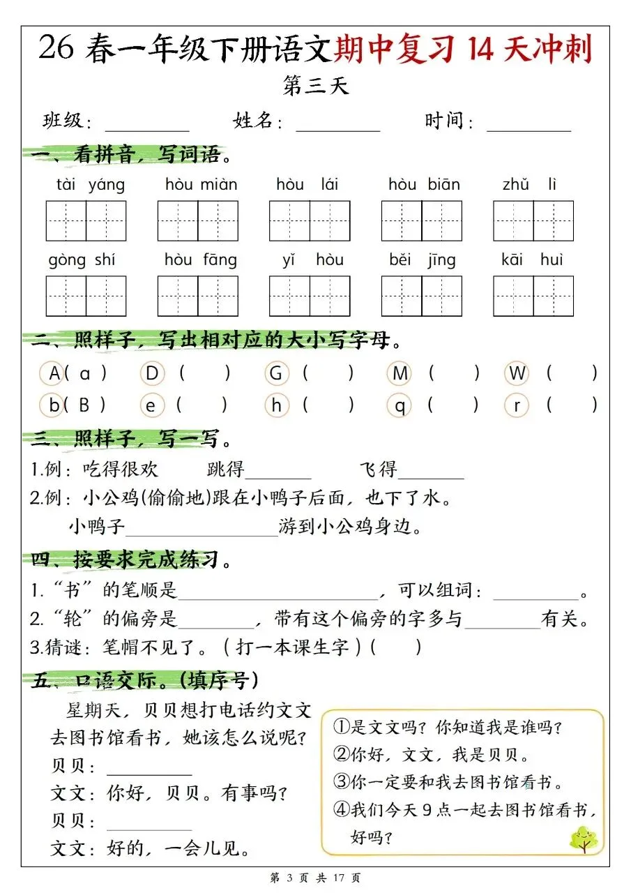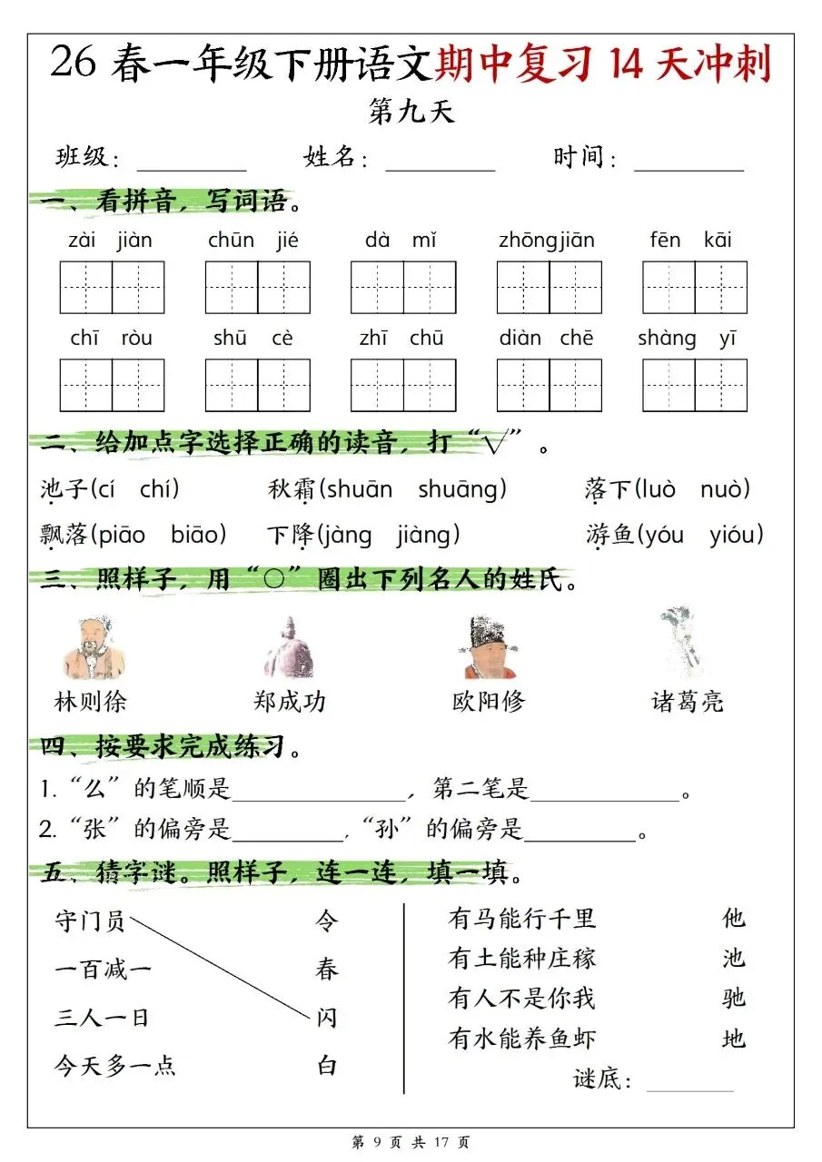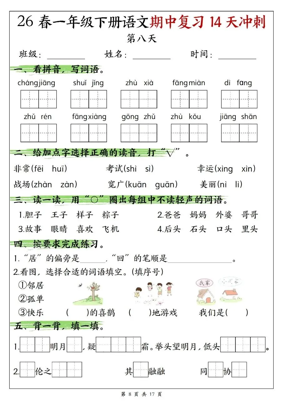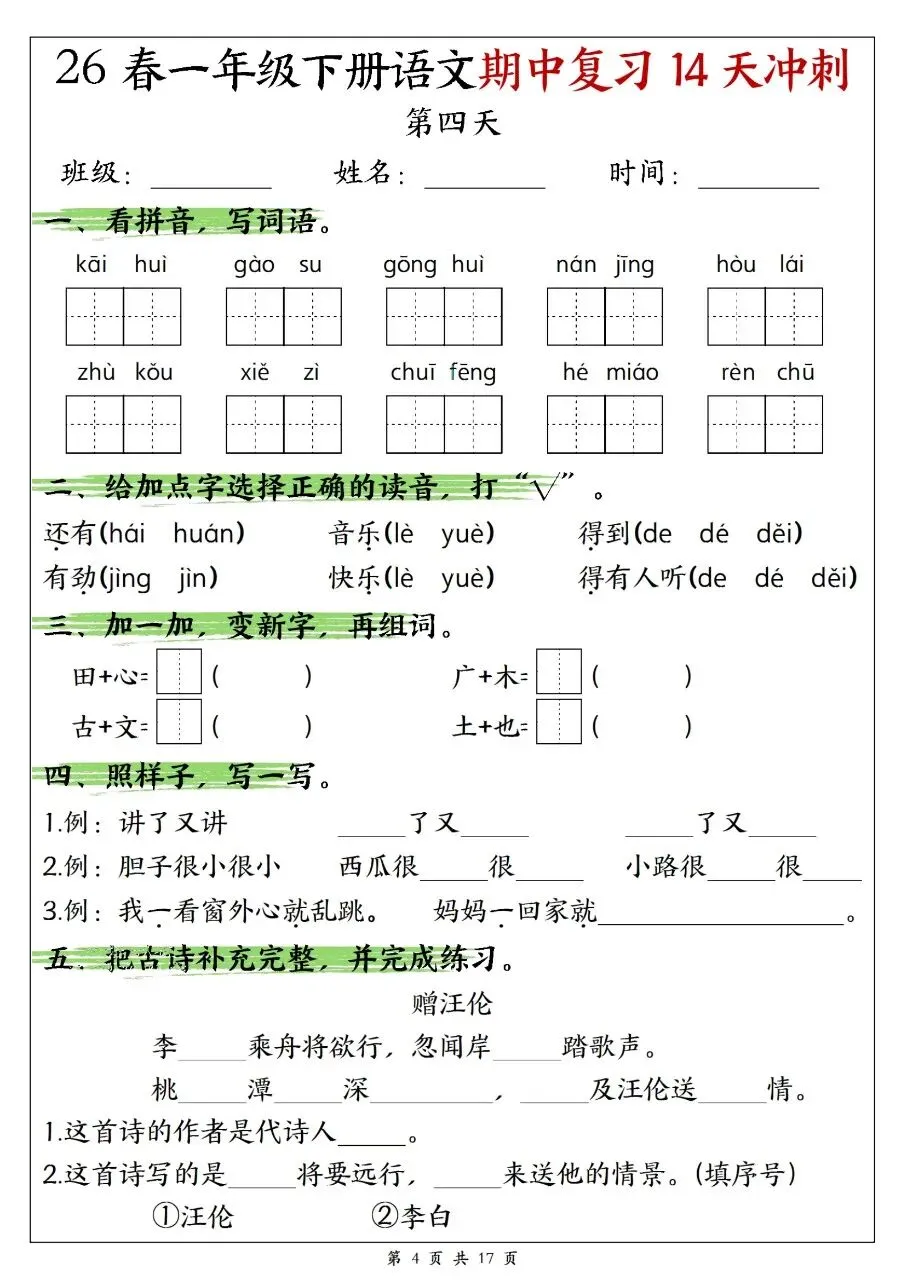 一年级下册语文期中复习14天冲刺含答案可打印