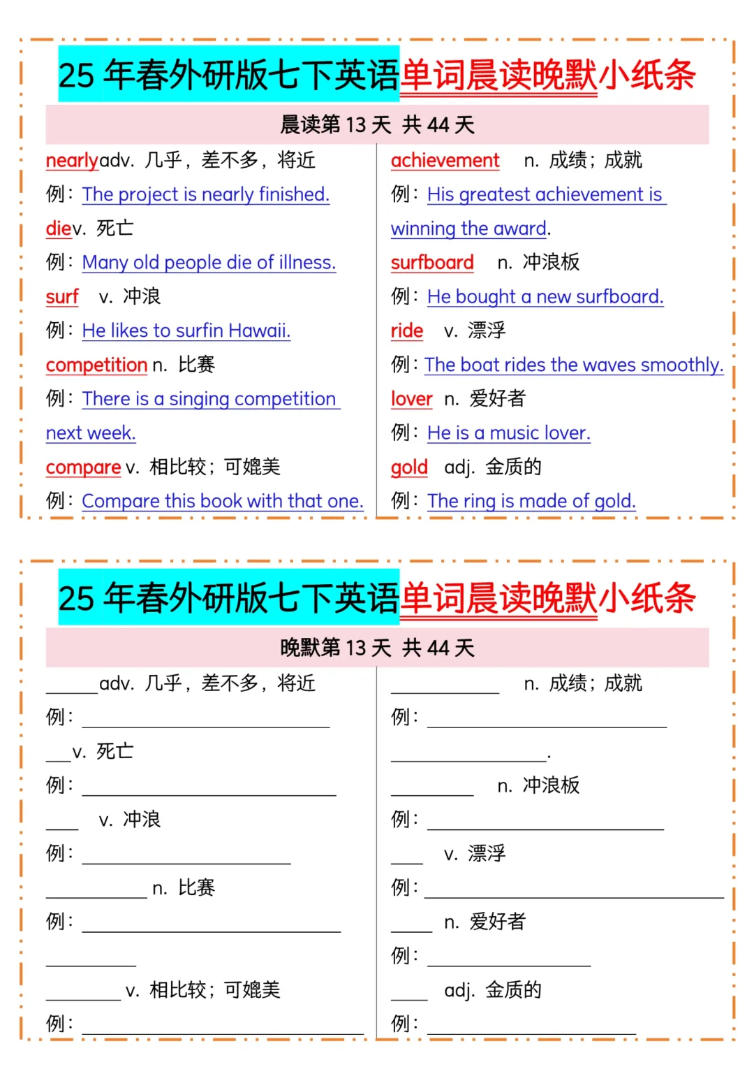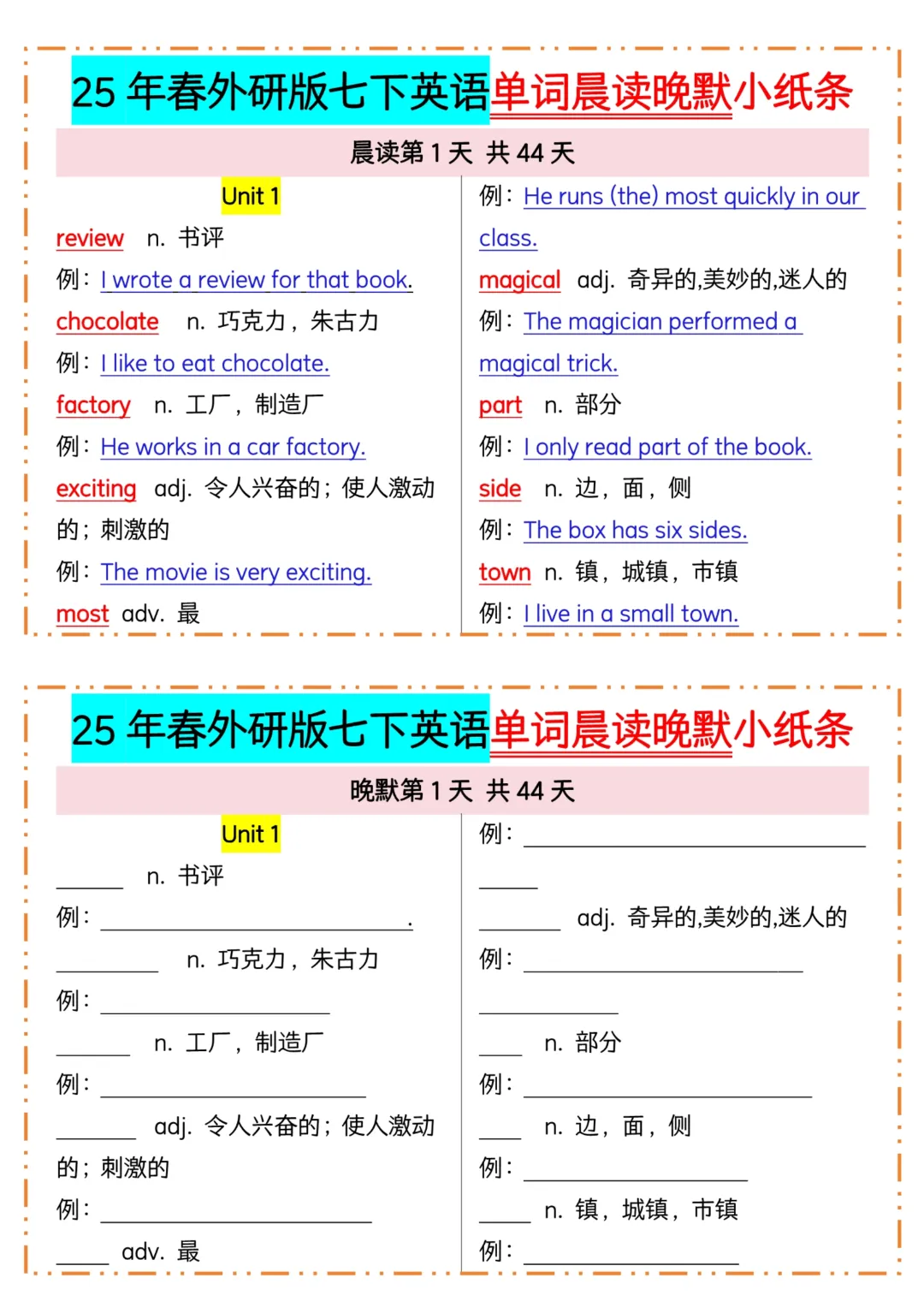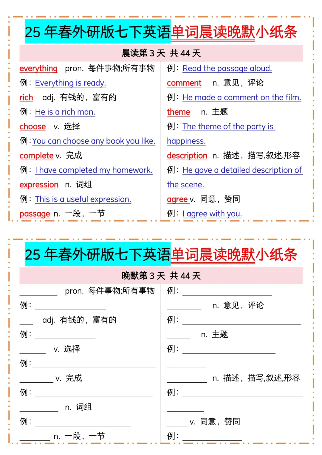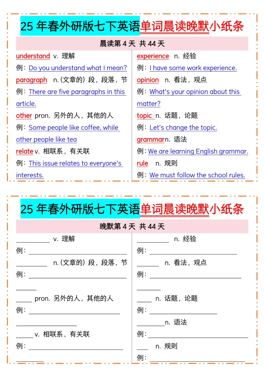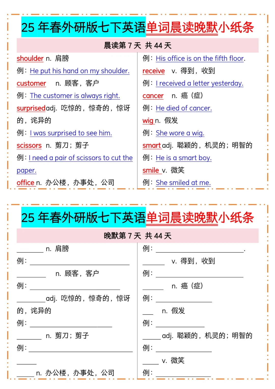 26春七年级下册外研版《单词晨读晚默小纸条》|高清电子版可打印