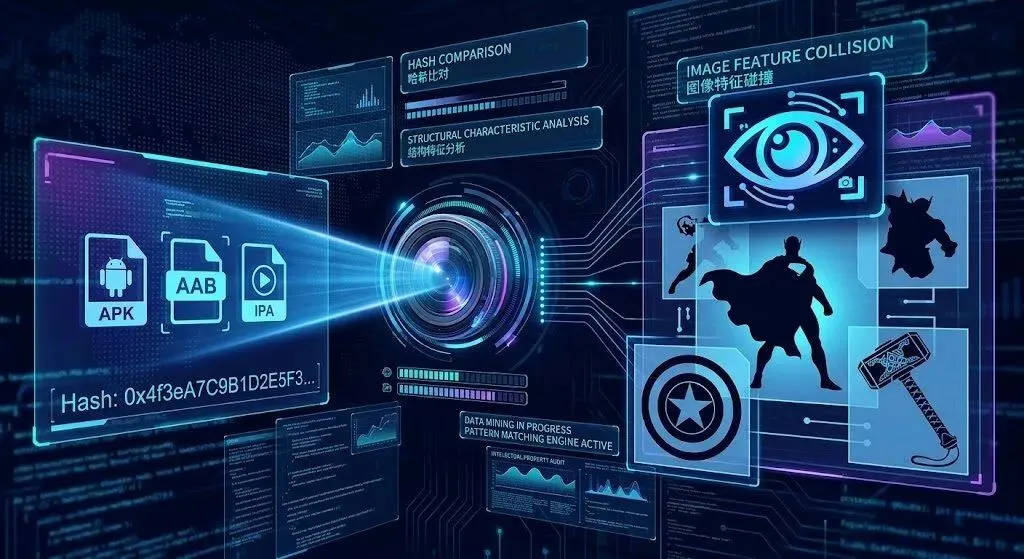 元数据(Metadata)与图片的机器视觉比对:系统会提取 APK/AAB 或 IPA 文件的整体哈希值、核心类的结构特征。同时,Google 和 Apple 具有强大的图像识别能力。如果商店截图中含有被大厂注册过版权的知名角色轮廓或标志性道具,系统会通过庞大的版权数据库进行特征碰撞。一旦碰撞成功,应用将直接因“未经授权使用版权内容”被拒审。
