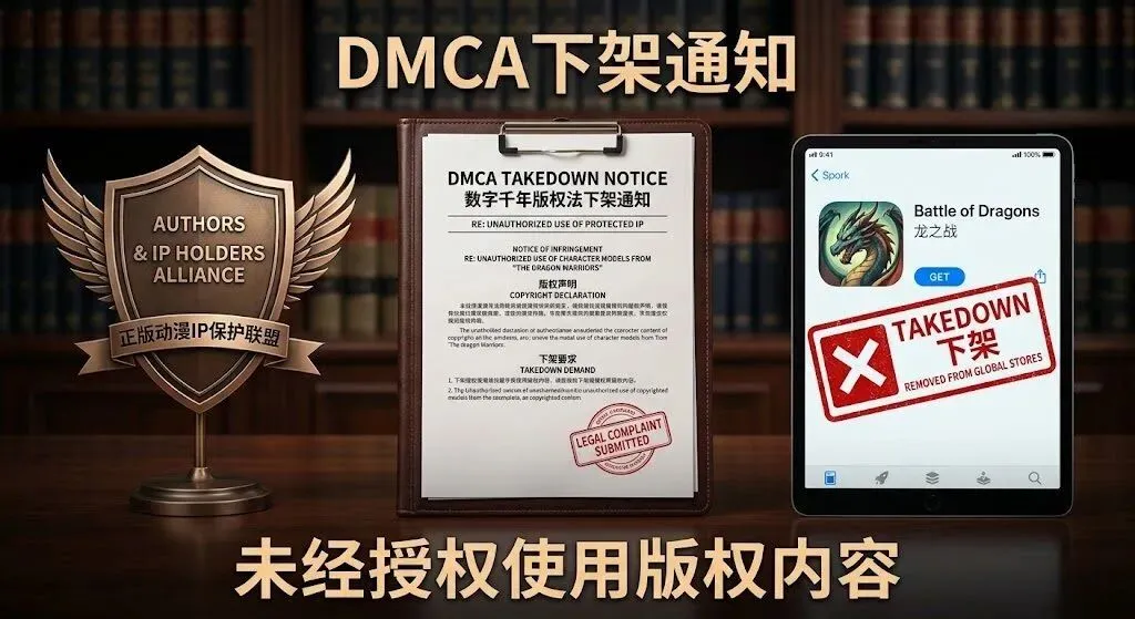 DMCA 版权投诉的“一剑封喉”:这是最致命的打击。即使你的擦边包侥幸通过了机审,一旦游戏在买量市场上引起注意,正版 IP 持有方(或其委托的维权机构)会直接向平台发送 DMCA Takedown Notice(下架通知)。 平台在处理此类法律合规诉求时,态度极其强硬。通常在核实权利人身份后,会不经事先警告直接将侵权应用全球下架。