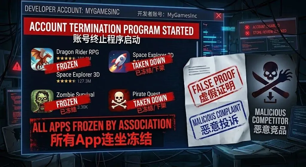 恶意投诉与账号的“连坐死局”:如果一个开发者账号频繁收到版权投诉,苹果或谷歌会直接启动 Account Termination(账号终止)程序。甚至会有恶意竞品利用虚假的版权证明进行恶意投诉。如果你的底层架构不够隐蔽,这种投诉会导致你名下的所有正常游戏惨遭连坐。