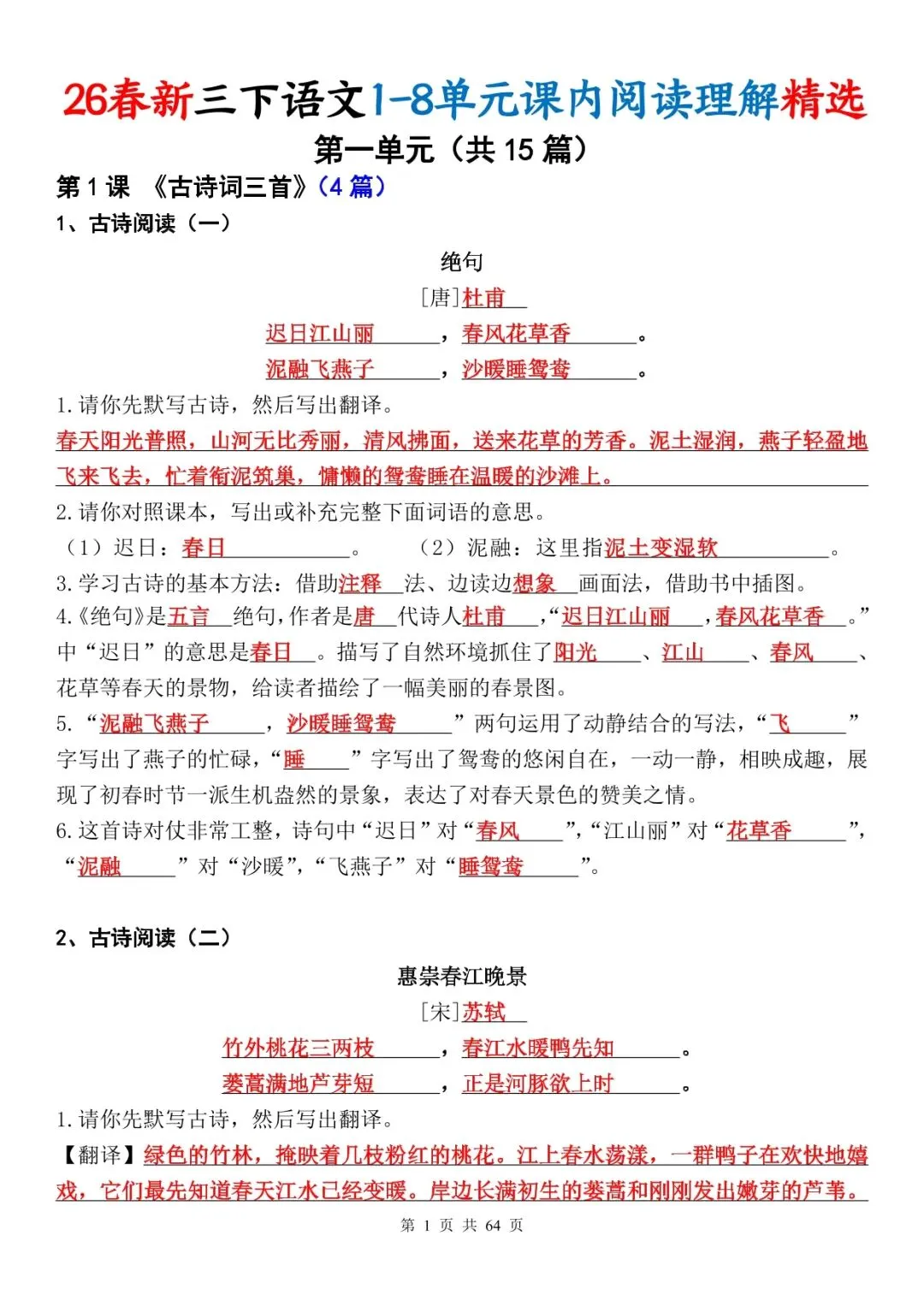 本资料专为2026 春季人教版三年级下册语文打造,聚焦课内阅读理解期中、期末高频考点,是三年级语文阅读理解专项提分必备。