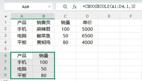 场景1: 我只要“产品”和“销量”两列,在图中也就是需要挑出第1列和第3列
