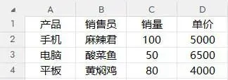 下面这张销售表,有“产品”、“销售员”、“销量”、“单价”4列