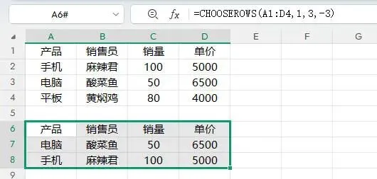 这里就不详细举例,同CHOOSECOLS一样的原理,只是将我们要找的列改成去找行,同样的负数行号也是代表倒数第几行,例如咱们要找第1行,第3行和倒数第3行: