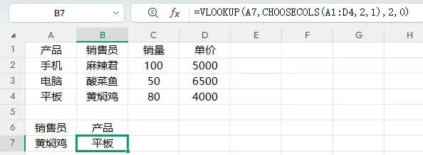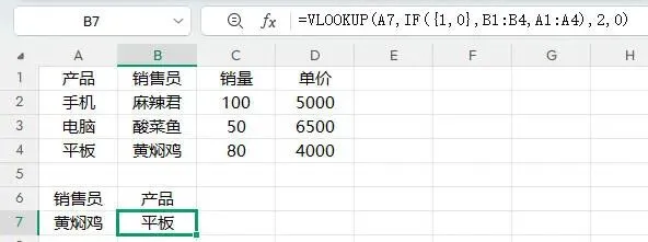 例如还是这个表,我们要按销售员去查找所销售的产品,如果按以前的IF({1,0}用法: