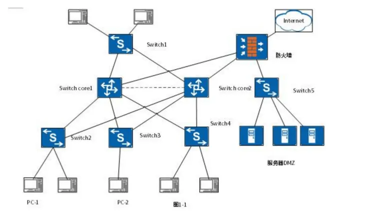 某企业办公楼网络拓扑如图1-1所示。该网络中交换机Switchl-Switch4均是二层设备,分布在办公楼的各层,上联采用千兆光纤。核心交换机、防火墙、服务器部署在数据机房,其中核心交换机实现冗余配置。
